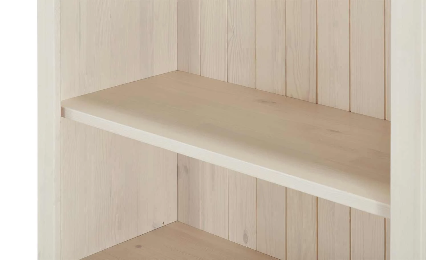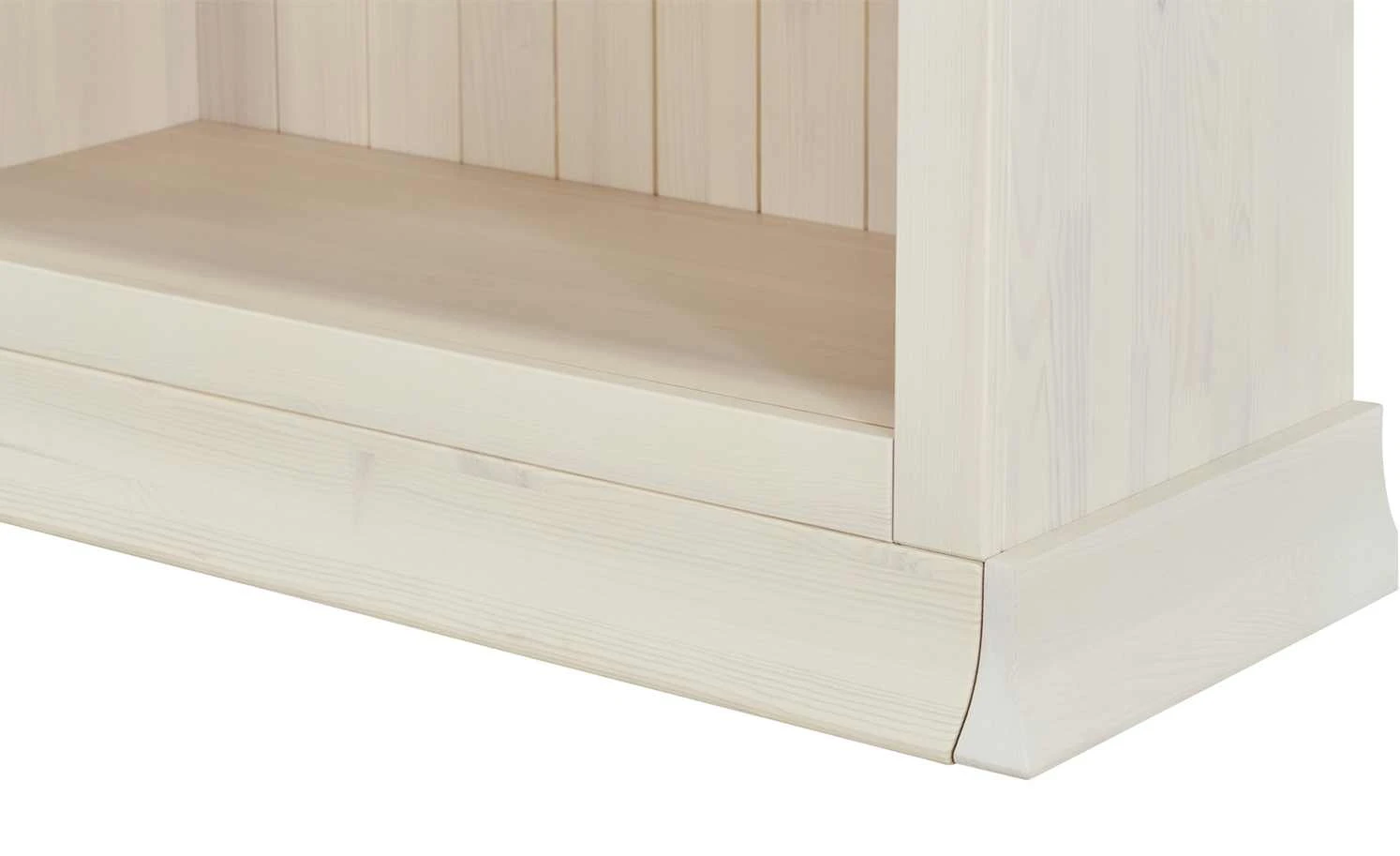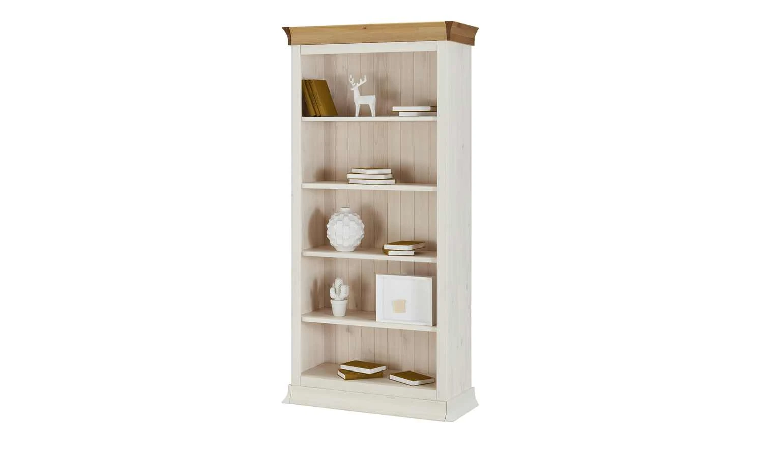 Das hohe Bücherregal in dezentem Weiß besticht durch seinen reizenden Charme und eine rustikale Note. Es besitzt eine Rückwand aus vertikalen Brettern, deren Struktur und Maserung gut sichtbar ist. Auch die Seitenwände und der obere und untere Abschluss bestehen aus massivem Kiefernholz. Vier Einlegeböden unterteilen das Regal in fünf gleichmäßige Fächer, die Bücher oder dekorative Gegenstände fassen können. Die Seiten des Sockels und des Kranzes lassen sich abnehmen, so dass mehrere Regale miteinander zu einer Bücherwand verbunden werden können.