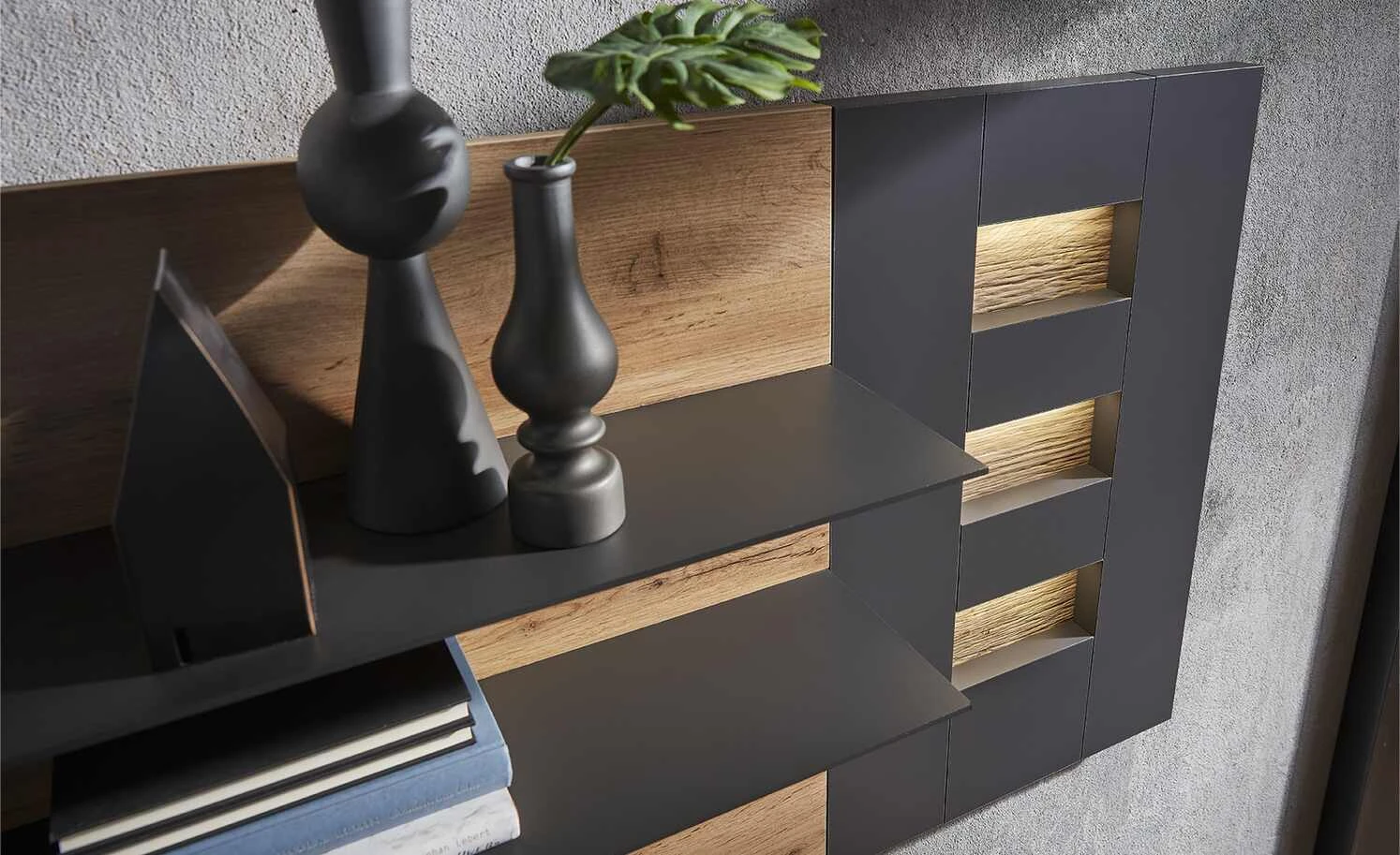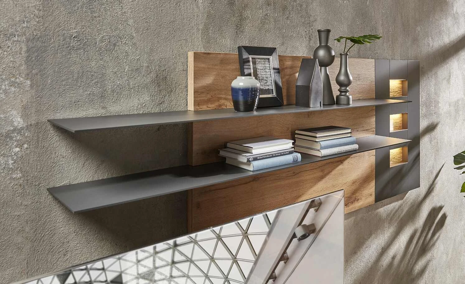 - nicht im Lieferumfang enthalten: Controller (für Beleuchtung notwendig), Lowboard, Regal, 3x LED-Beleuchtung