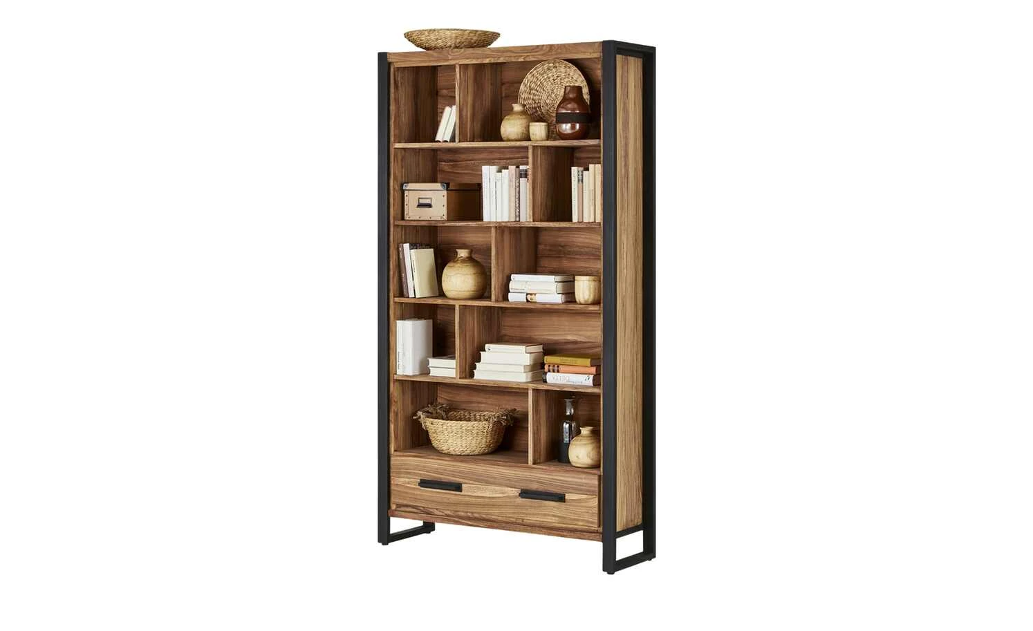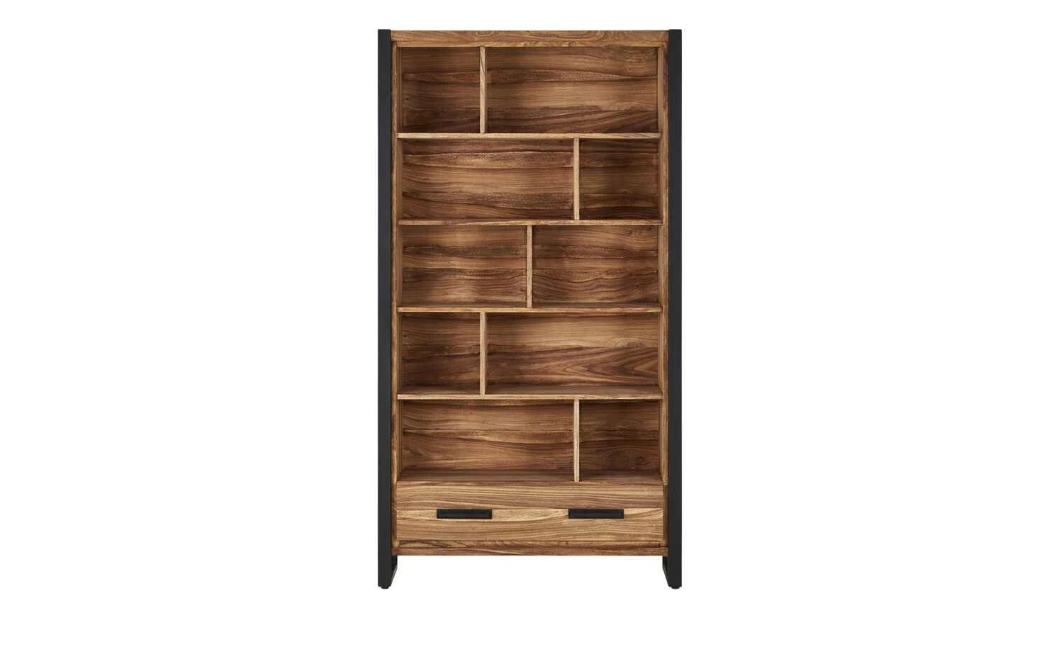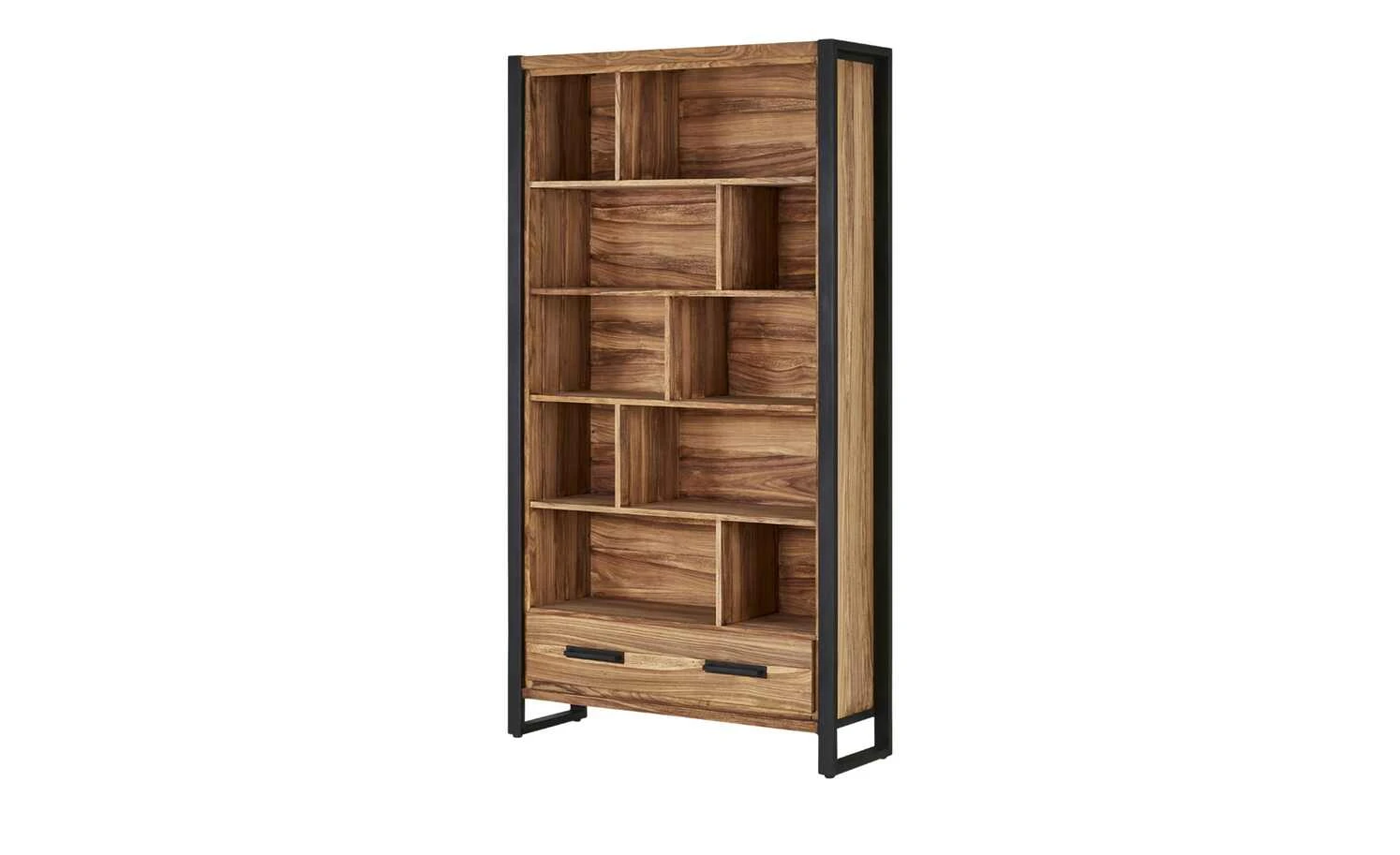 Für Bücher, Ordner oder Deko eignet sich das Bücherregal Tierra Fuego One von Gray & Jones. Es ist mit zehn Fächern und einem Schubkasten ausgestattet. Die Regalfächer sind unterschiedlich groß und divers angeordnet. Dieser Look harmoniert mit der Gesamtoptik des Regals im Industrial-Style. Tierra Fuego One ist mit Sheesham furniert, wobei sich das Holz durch seine starke Maserung auszeichnet. Das Kufengestell besteht aus schwarzem Eisen. Es setzt Kontrastakzente.