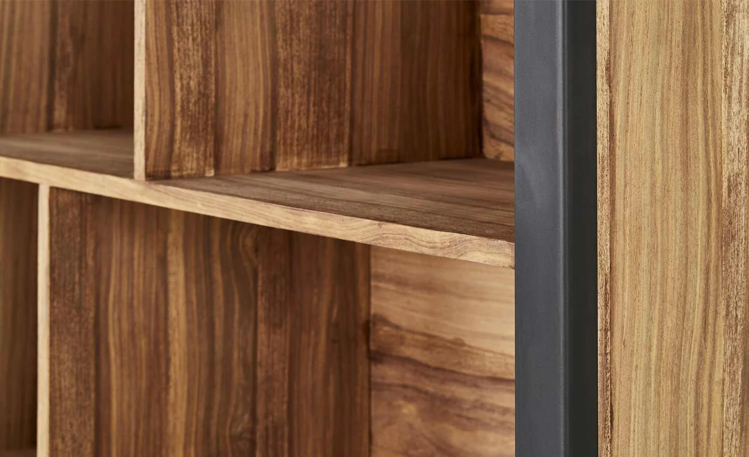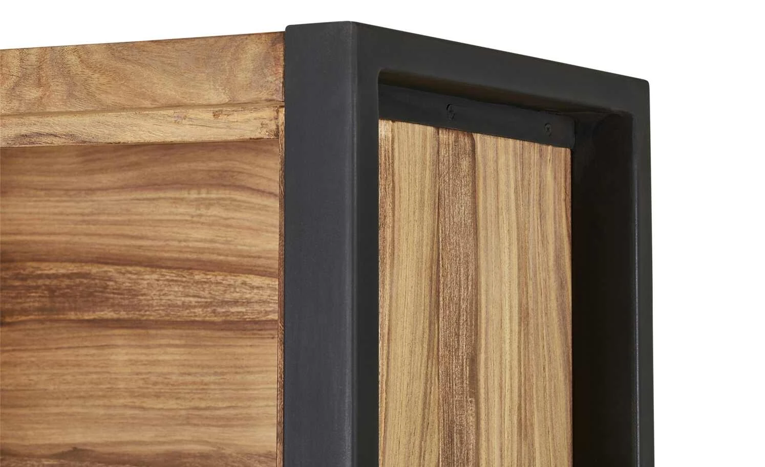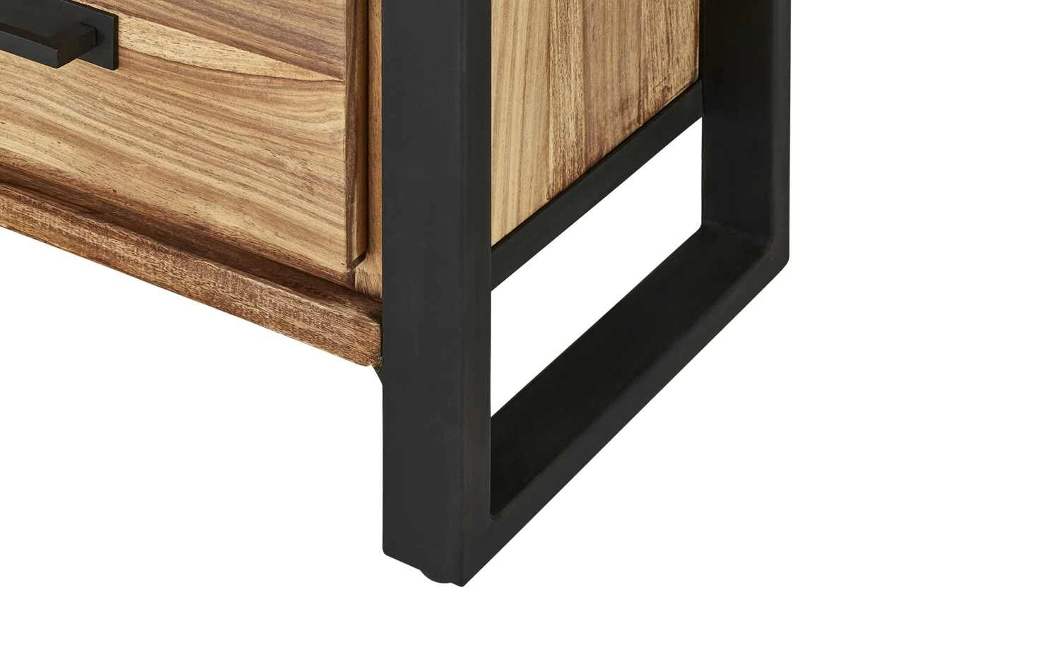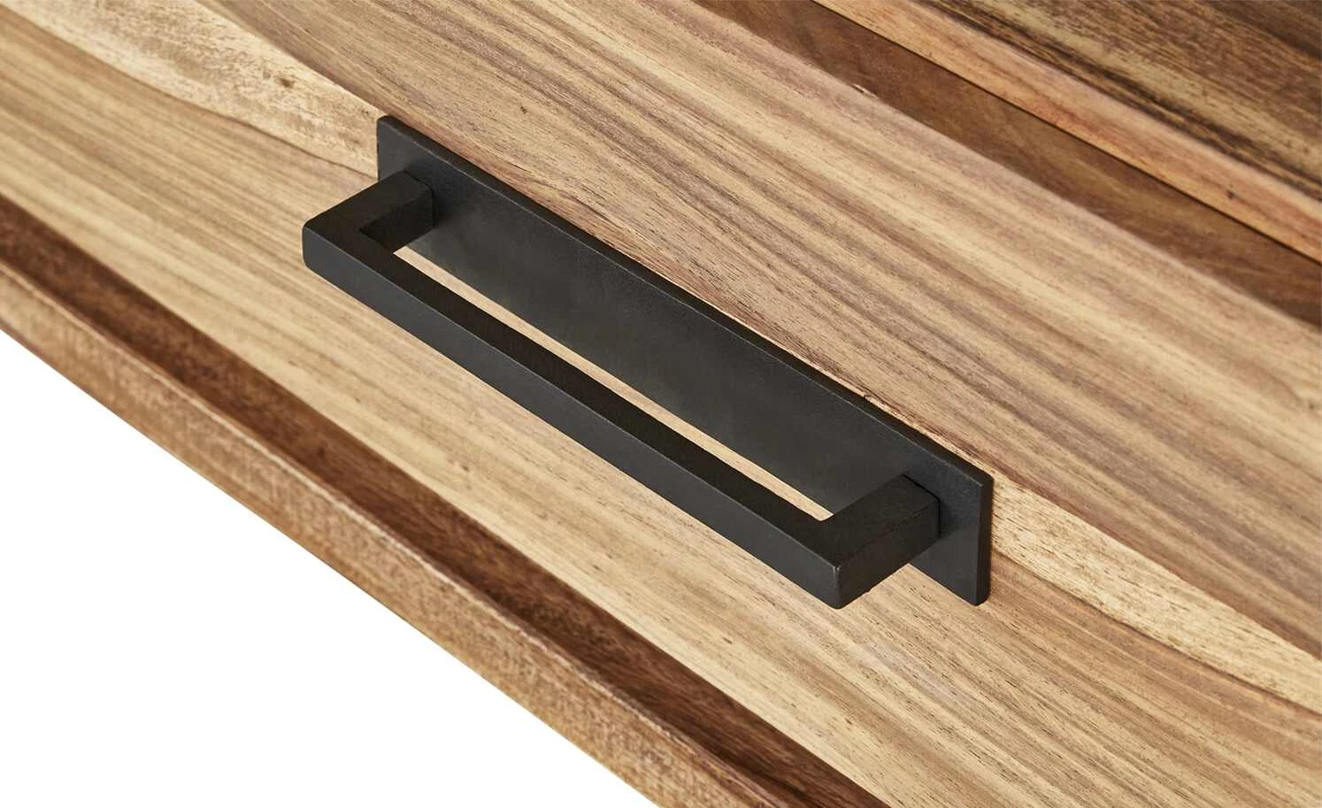 - Mehr zum Material: Griffe & Gestell: Eisen Schwarz lackiert, Korpus & Front: Tischlerplatte Sheesham furniert natur, Tischlerplatte: Vollholz-Platte mit zwei Schichten aus Sheeshamfurnier und einer mittleren Schicht aus Kiefer-Massivholz-Leisten