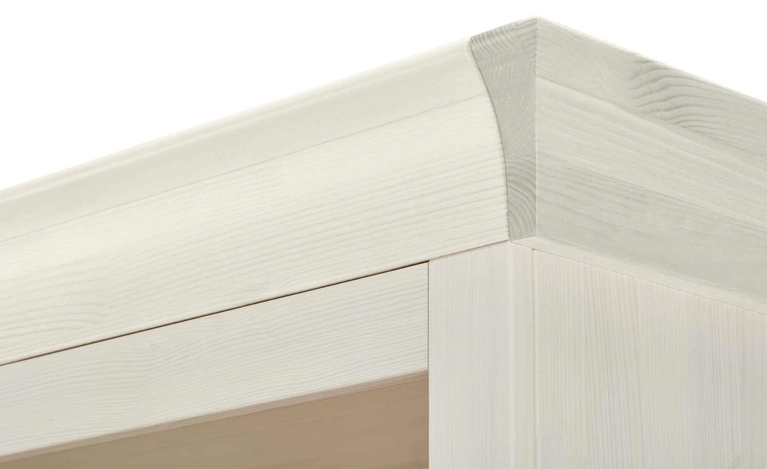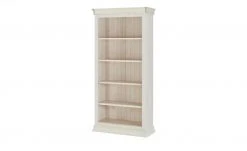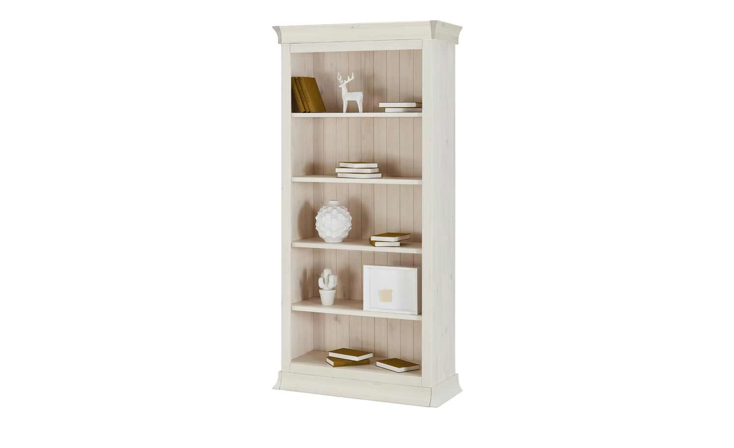 Das hohe Bücherregal in dezentem Weiß besticht durch seinen reizenden Charme und eine rustikale Note. Es besitzt eine Rückwand aus vertikalen Brettern, deren Struktur und Maserung gut sichtbar ist. Auch die Seitenwände und der obere und untere Abschluss bestehen aus massivem Kiefernholz. Vier Einlegeböden unterteilen das Regal in fünf gleichmäßige Fächer, die Bücher oder dekorative Gegenstände fassen können. Die Seiten des Sockels und des Kranzes lassen sich abnehmen, so dass mehrere Regale miteinander zu einer Bücherwand verbunden werden können.