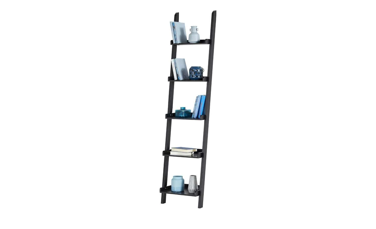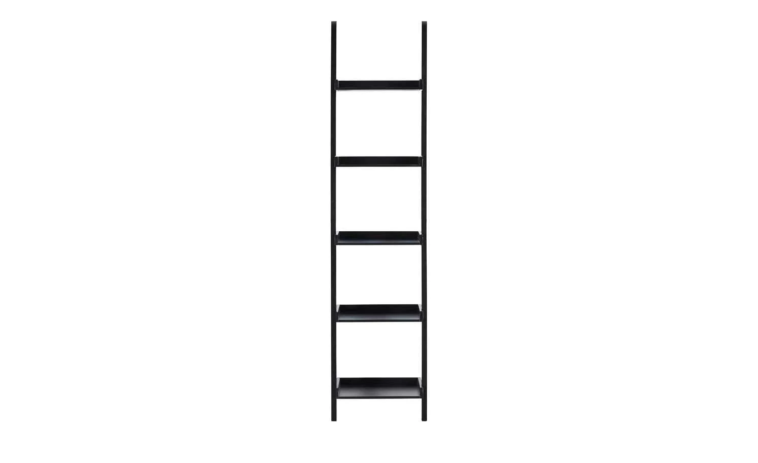 Das moderne Regal schmiegt sich wie eine Leiter an die Wand. Statt der Leitersprossen befinden sich in regelmäßigen Abständen jedoch fünf Regalböden zwischen den Holzlatten aus massivem Kiefernholz, die das Regal rechts und links begrenzen. Der untere Boden ist am tiefsten, nach oben hin werden die Böden immer schmaler. Bücher und Bildbände oder dekorative Gegenstände wie Bilderrahmen und Vasen werden im Leiterregal gut in Szene gesetzt. Eine dreiseitige Begrenzungsleiste verhindert das Herunterfallen von Gegenständen.
