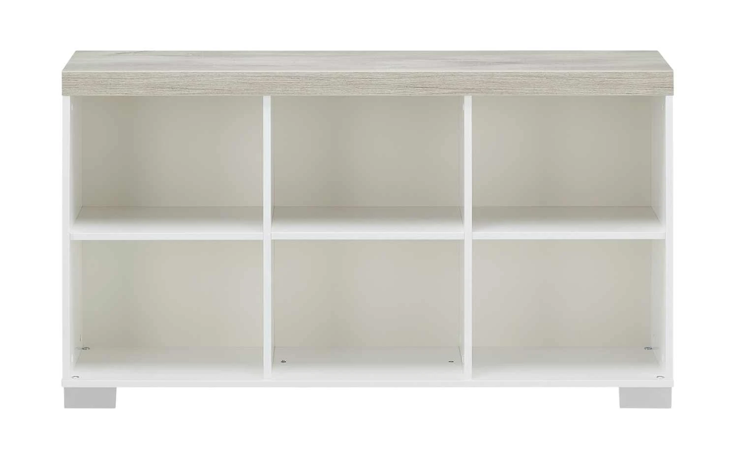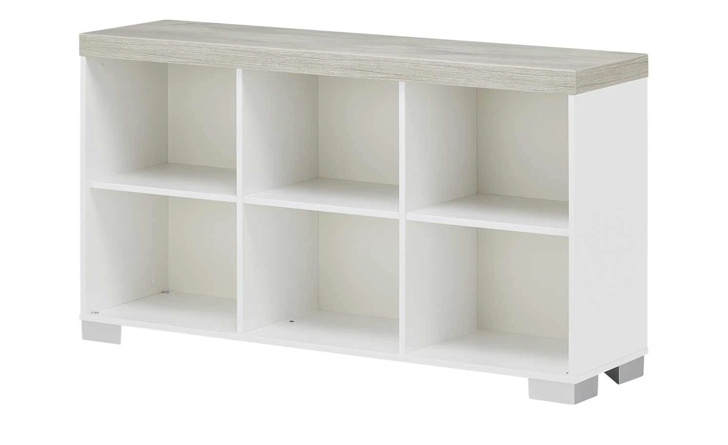 Gleich sechs praktische Fächer hat das Regal Kira von PAIDI. Jeweils drei sind nebeneinander in zwei Reihen angelegt. Korpus und Böden sind in Kreideweiß designt, die Abdeckplatte setzt sich in Eiche Nautik (Nachbildung) ab. Sie hat eine holztypische Oberflächenstruktur, die die Nachbildung noch echter wirken lässt. Das Regal hat eine erstklassige Qualität und ist mit diversen Gütesiegeln ausgezeichnet.