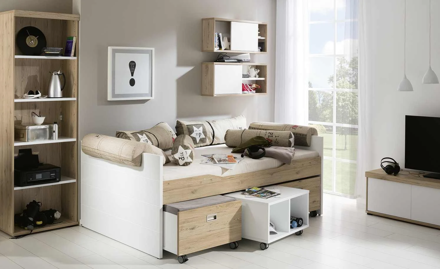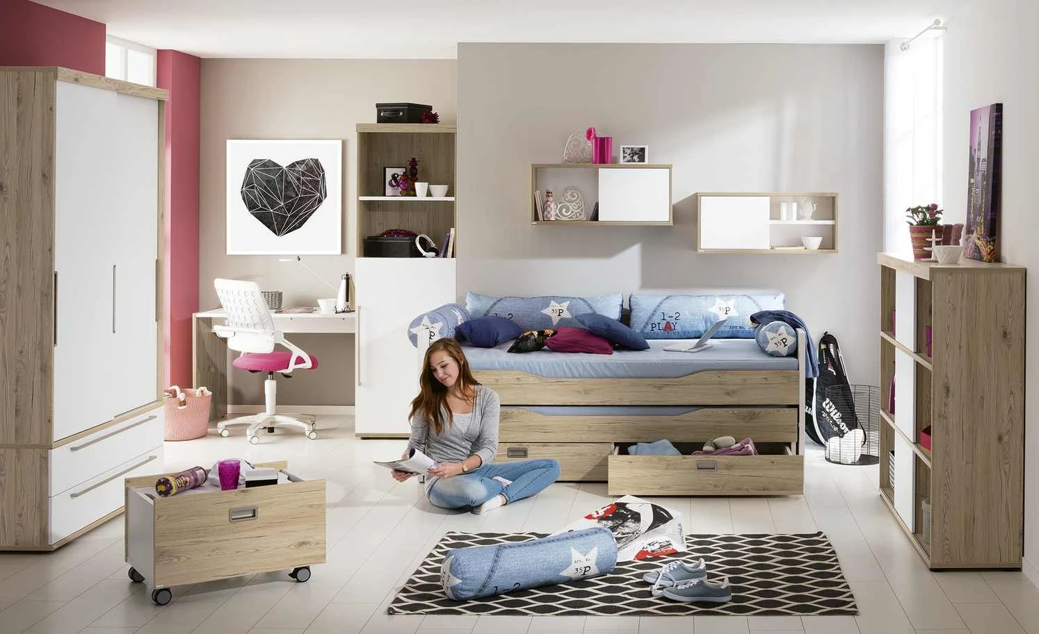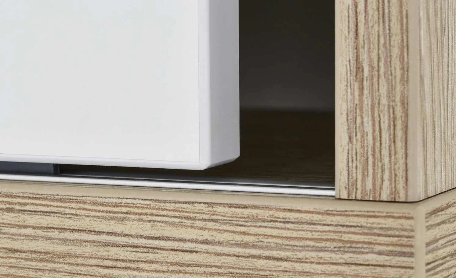 Stauraum an der Wand – den schafft das Wandregal Fionn von PAIDI. Es verfügt über zwei Fächer. Die Schiebetür kann nach Belieben links, rechts oder mittig platziert werden. Alle Oberflächen sind mit Melaminharz beschichtet, was sie kratzerunempfindlich macht.
