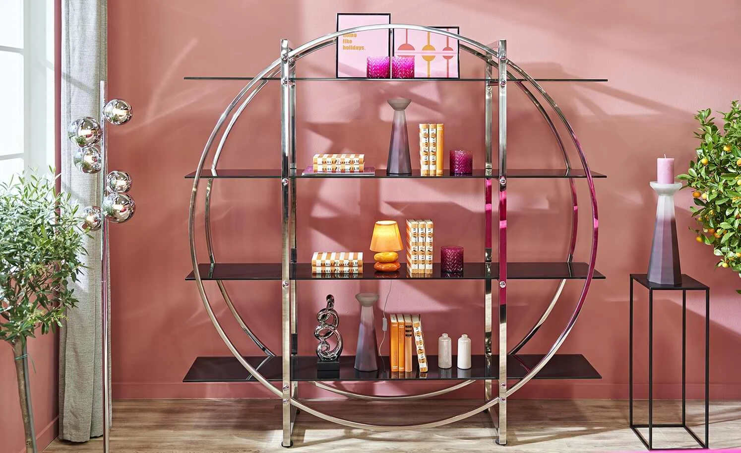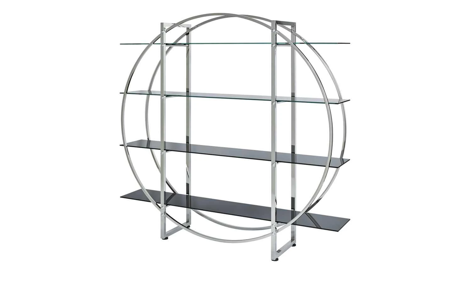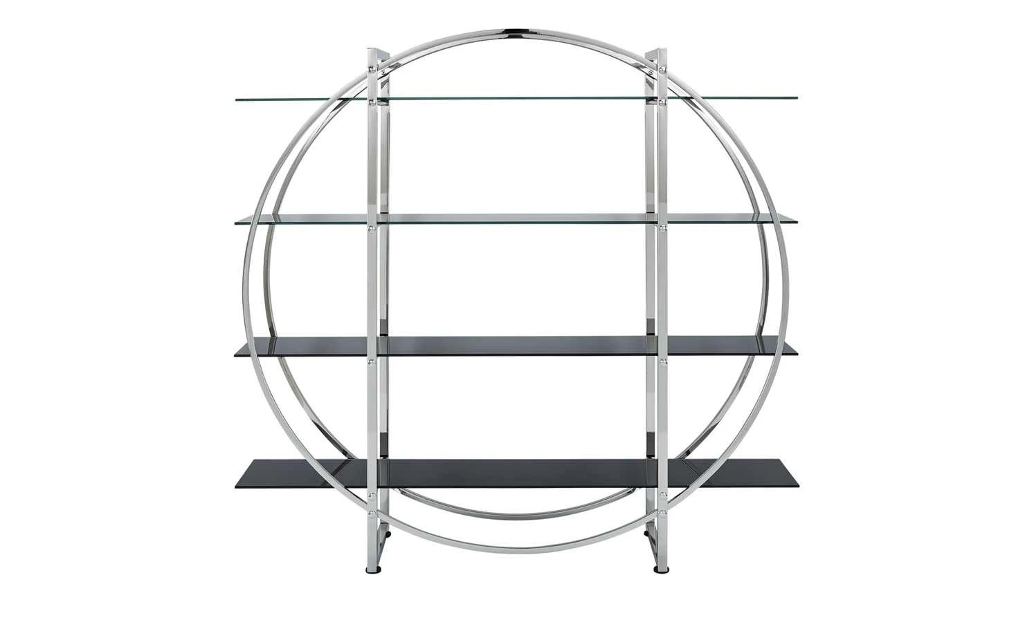 Das Regal Circle fällt durch sein modernes, geometrisches Design ins Auge. Die Geradlinigkeit von Gestell und Böden wird durch ein zweites, kreisförmiges Gestell abgesetzt. Der hochglänzende Chromlook bringt das außergewöhnliche Design noch besser zur Geltung. Die Regalböden sind aus Glas gefertigt und haben eine kontrastreiche schwarze Farbe. Ihnen stehen insgesamt vier Böden zur Verfügung, die Sie vielfältig nutzen können. Circle punktet nicht nur mit Design und praktischem Nutzen, sondern auch mit einer qualitativen Verarbeitung.