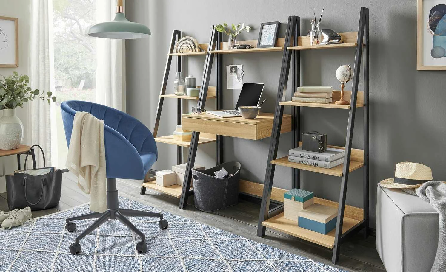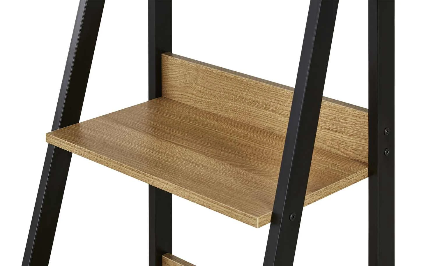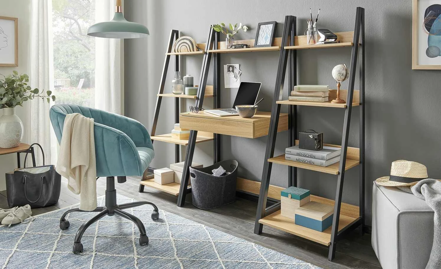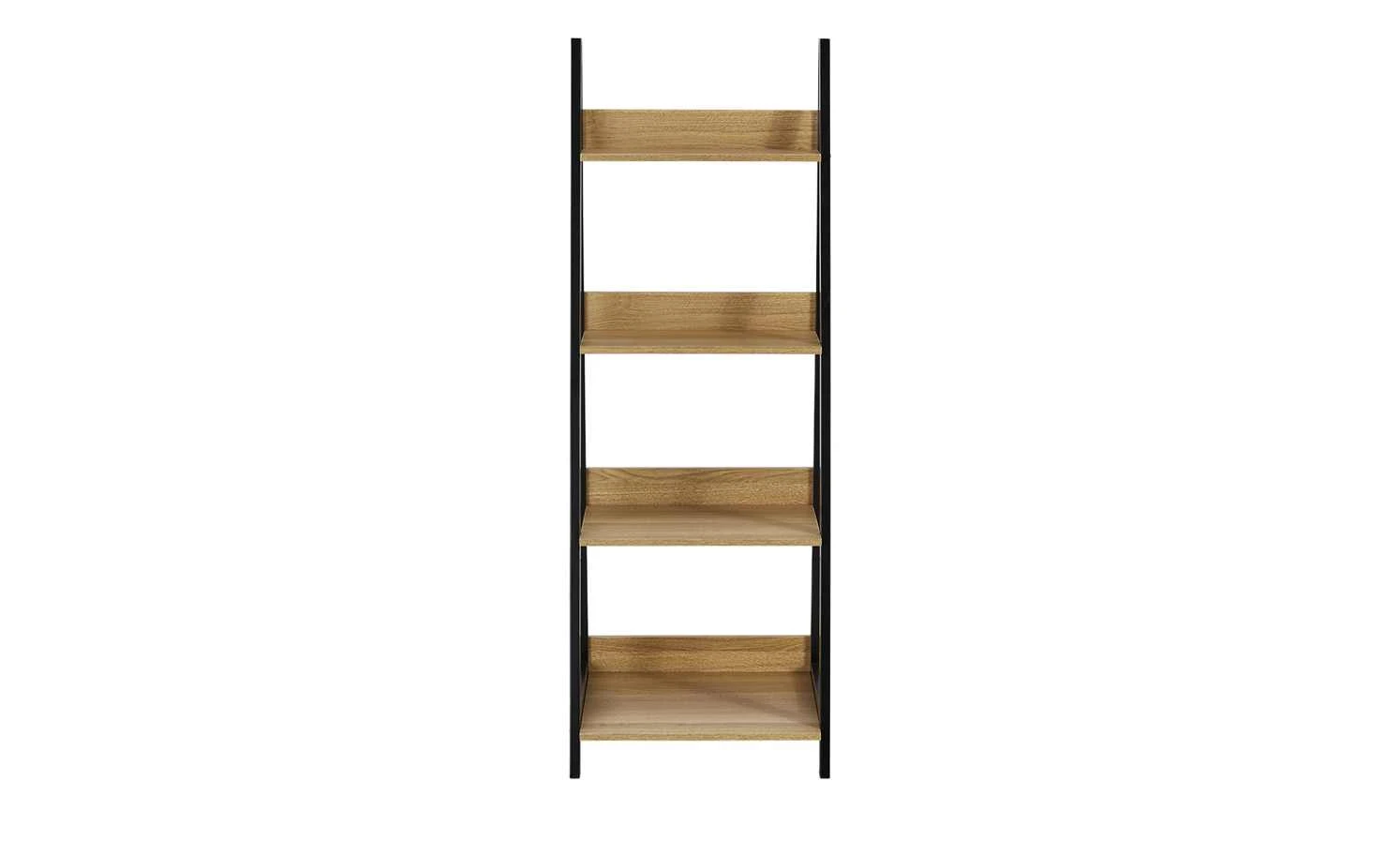 Ciron ist ein praktisches Regal mit stylischem Design. Die vier Regalböden sind unterschiedlich groß, wobei die Tiefe von oben nach unten zunimmt. Sie sind melaminbeschichtet, was sie strapazierfähig macht. Die Eiche sägerau (Nachbildung) wird vom schwarzen Gestell abgesetzt. Es ist aus standfestem Metall.
