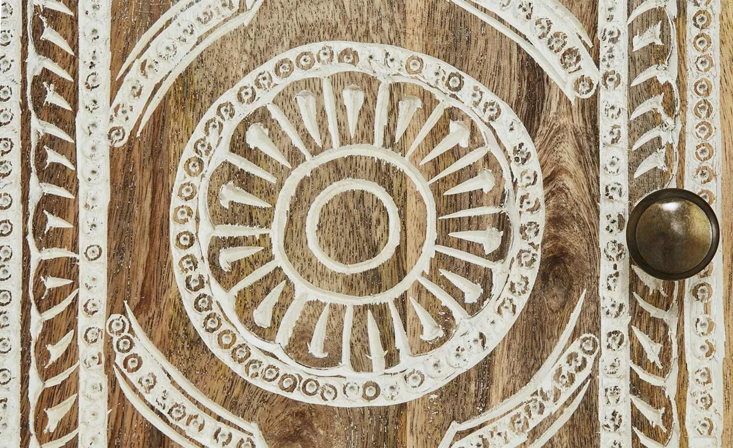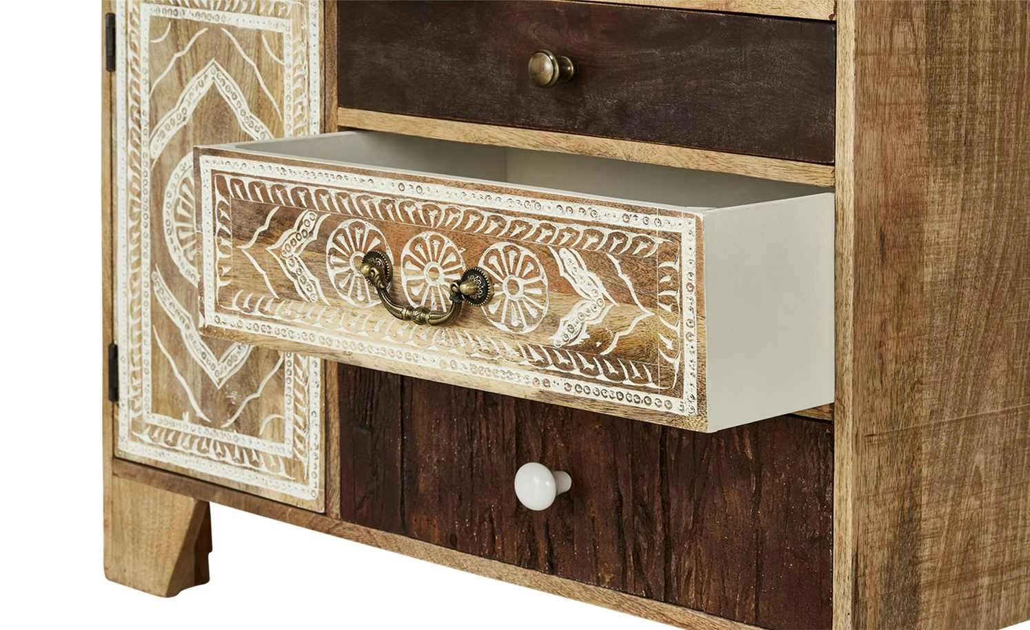 Delhi ist ein hochwertiges Regal mit exotischer Optik. Die Front ist detailreich und liebevoll verziert. Zum Teil hat sie eine Altholzoptik. Für die Front wurde Akazie verwendet. Der Korpus besteht aus massivem Mangoholz. Korpus und Front sind gebeizt und lackiert. Delhi hat vier offene Fächer in unterschiedlicher Größe. Zudem können Sie vier Schubladen und drei Türen nutzen. Eine der Türen ist mit einem Glaseinsatz versehen.