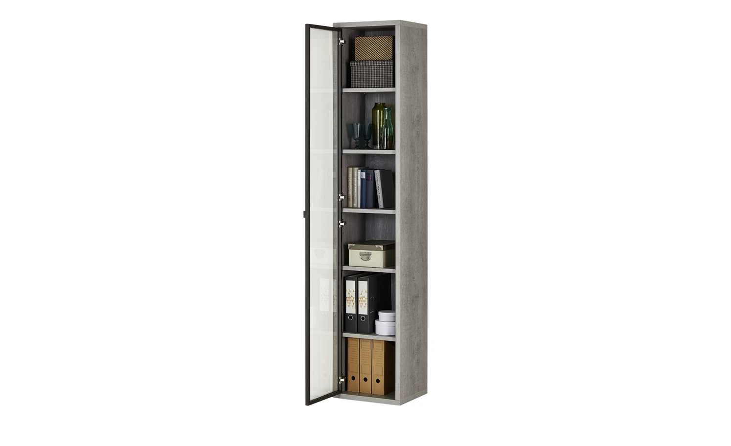 Durch die schmale und hohe Formgebung benötigt das Regal Donau wenig Stellfläche. Dennoch bietet es Ihnen viel Platz. Das Regal hat nämlich sechs Fächer für Ordner und andere Dinge, die Sie im Büro benötigen. Donau ist mit einer Melaminbeschichtung versehen. Dadurch ist die Oberfläche strapazierfähig. Die Kanten werden durch die ABS-Beschichtung vor Abnutzung geschützt. Die Betonoptik in Grau lässt das Regal schlicht und modern zugleich aussehen.