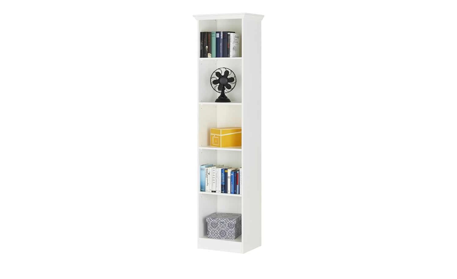 Mit seinen fünf großen Fächern bietet das Regal Laurito richtig viel Platz. Nutzen Sie ihn zum Beispiel für Bücher, Ordner oder ein paar hübsche dekorative Dinge. Die vier Einlegeböden können Sie in der Höhe verstellen – und so die Größe der Fächer individuell anpassen. Korpus und Böden sind mit Melamin beschichtet. Das sorgt für kratzerunempfindliche und pflegeleichte Oberflächen. Der Weißton harmoniert mit den Verzierungen, die an den Vintage- und Landhausstil erinnern.