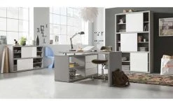 Dieses große Bürogregal bietet viel Platz für Ordner, Bücher und andere Büromaterialien. Die drei Schiebentüren in Hochglanz-Weiß können Sie individuell ausrichten.