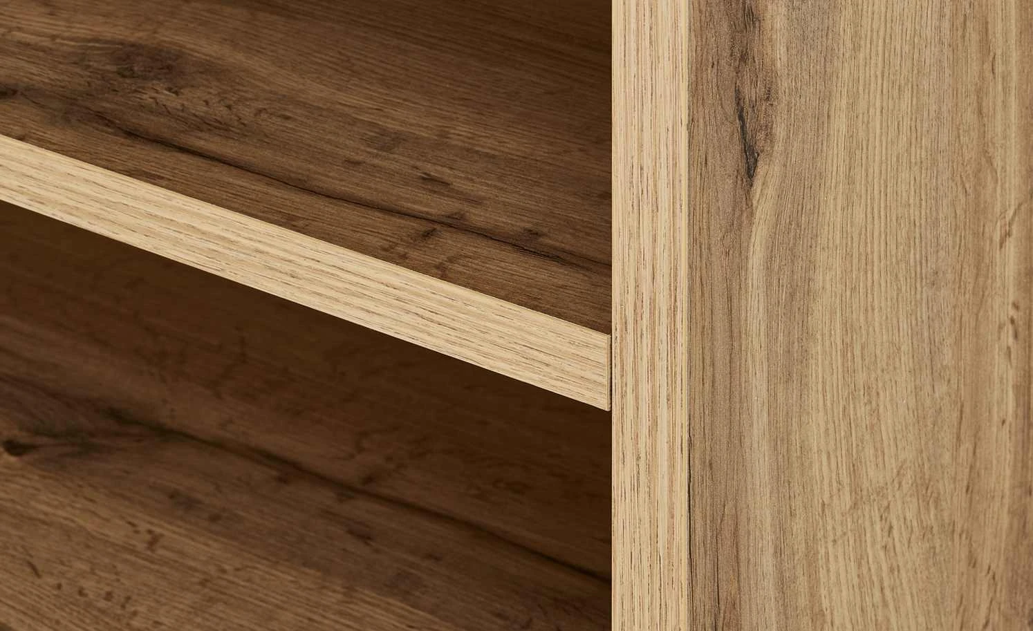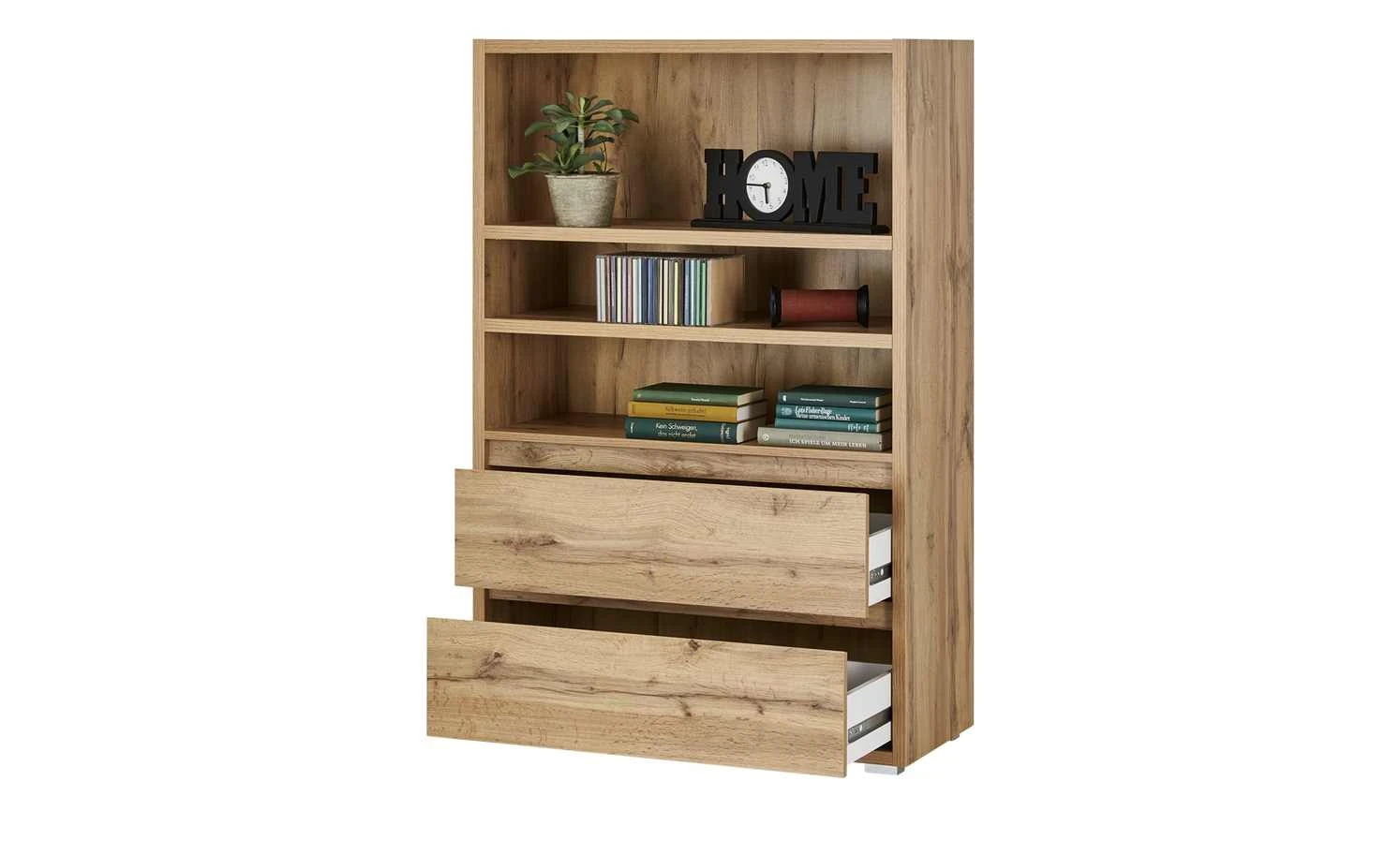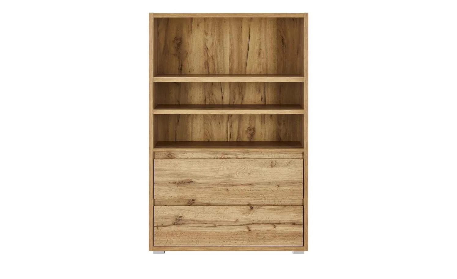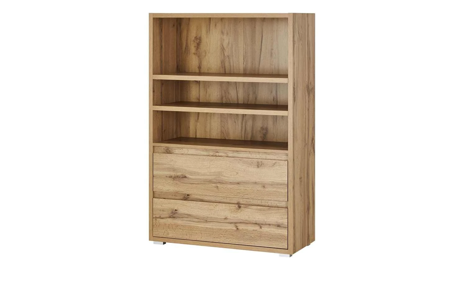 Vielseitigen Stauraum, den erhalten Sie mit dem Regal Tarent. Der obere Regalteil unterteilt sich in drei Fächer. Die beiden Einlegeböden dazwischen sind in der Höhe variabel. So können Sie die Fächer in der Größe regulieren. Des Weiteren bietet Tarent zwei geräumige Schubladen, die sich über die gesamte Breite des Regals erstrecken. Tarent ist geradlinig designt und komplett in Honigeiche (Nachbildung) gehalten. Die Holzoptik gibt dem modernen Look einen natürlichen und rustikalen Charme.