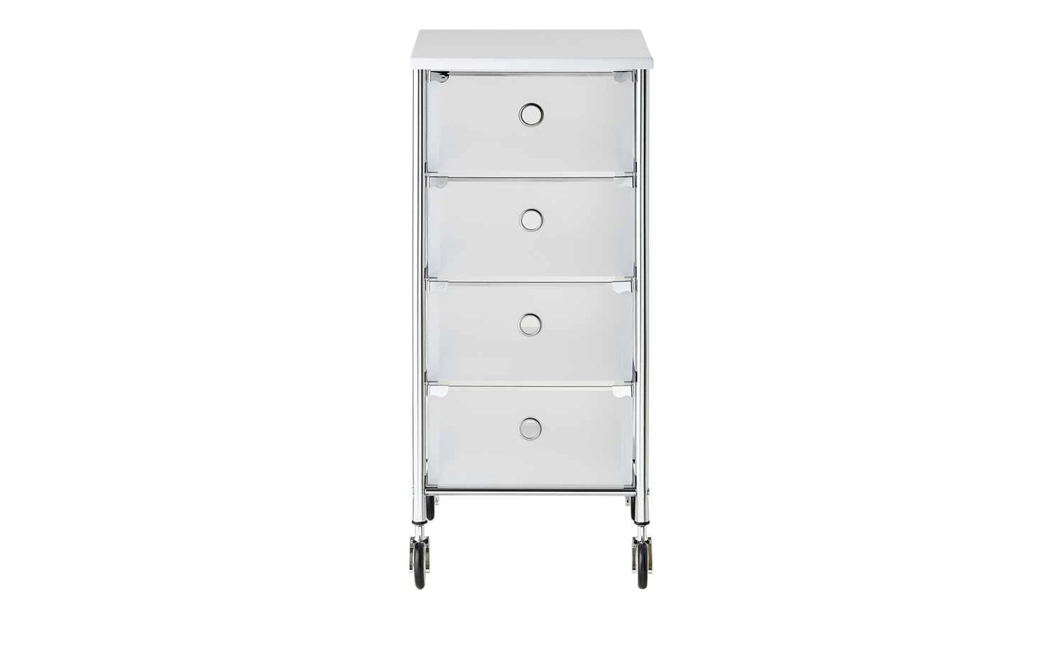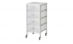 Den Rollcontainer Ronda können Sie in Schlafzimmer und Küche genauso nutzen wie im Bad. Wie die Bezeichnung schon verrät hat Ronda vier praktische Rollen, durch die Sie ihn einfach bewegen können. In den vier Schüben finden allerlei Dinge ihren Platz. Das Gestell ist aus Metall und verchromt, die Schübe bestehen aus Kunststoff. Die Abdeckplatte hat eine strahlende Hochglanz-Optik in Weiß.