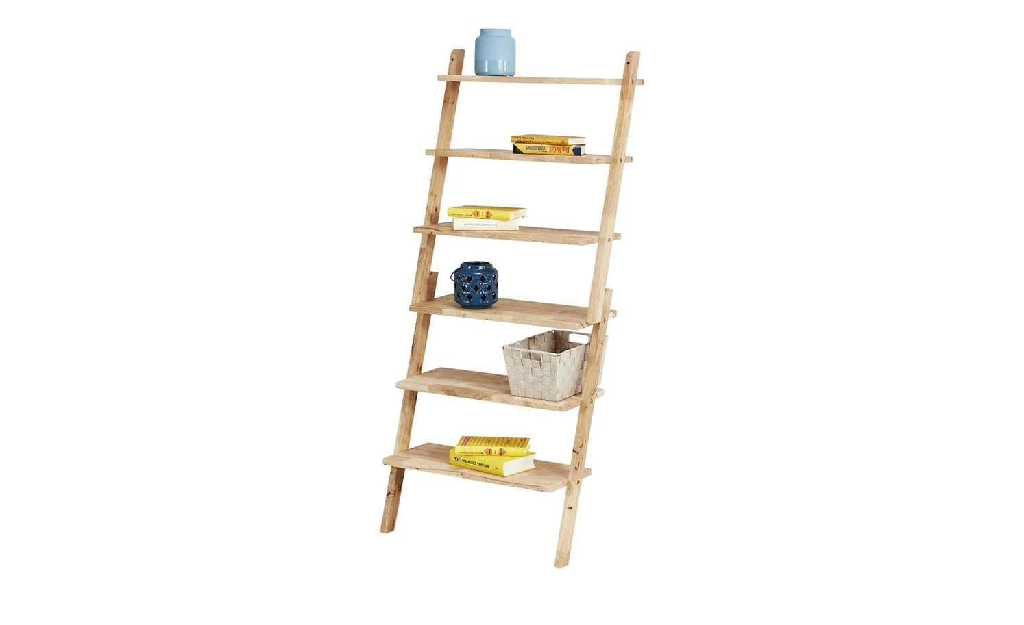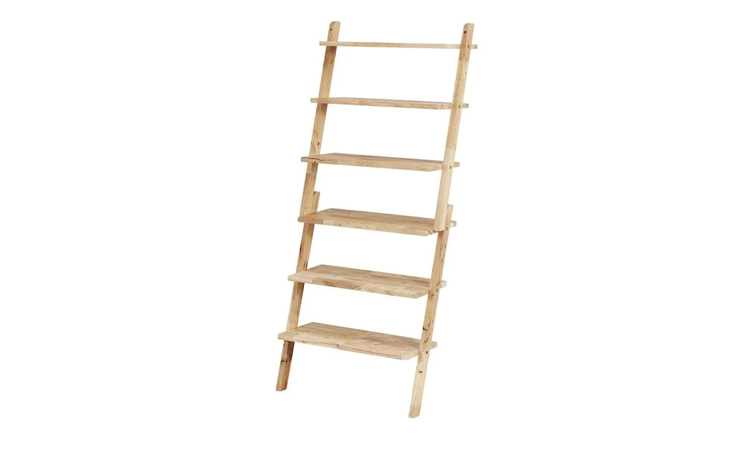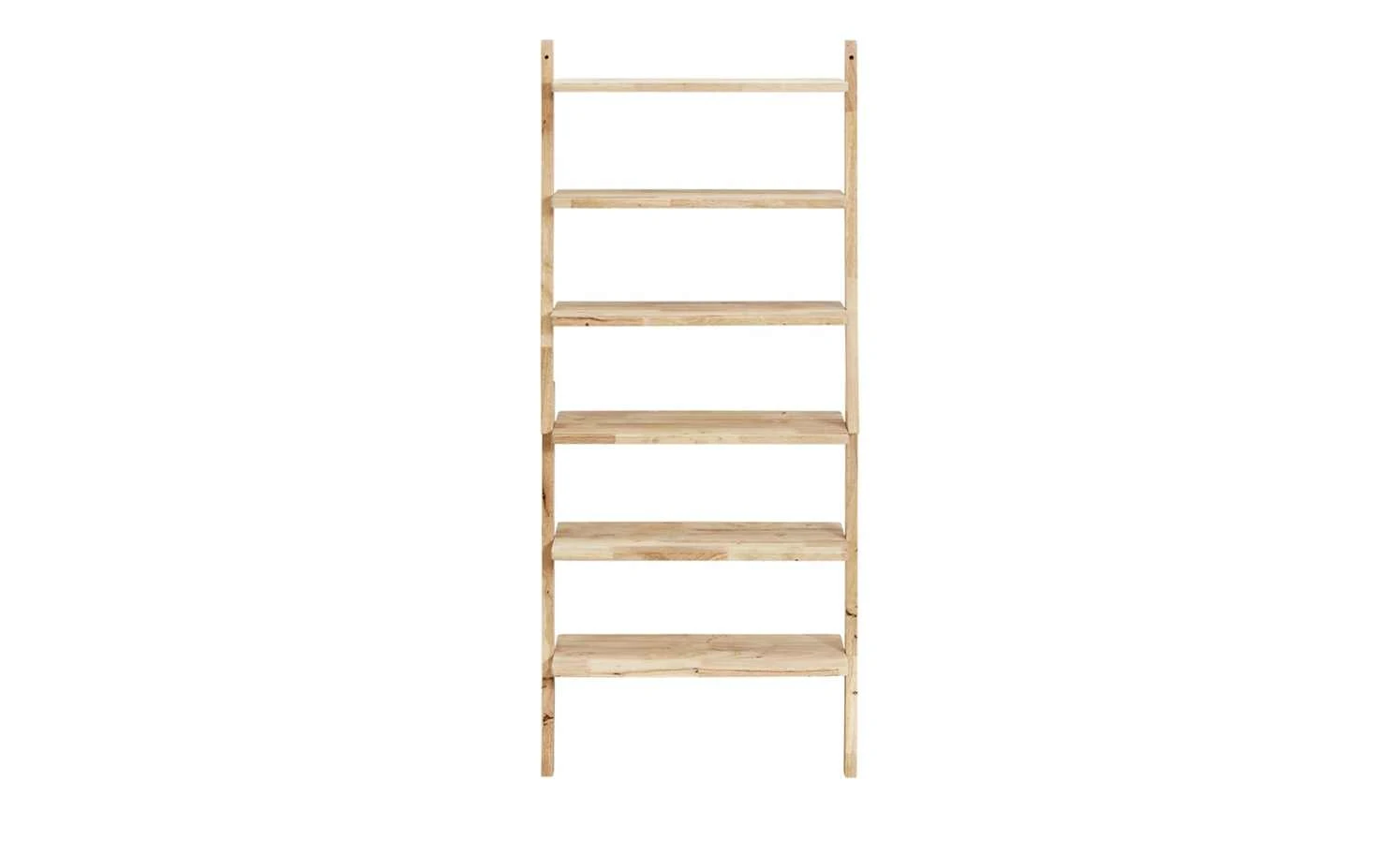 An eine Leiter erinnert das Regal Nate. Das Regal wird schräg an eine Wand angelehnt und anschließend an ihr befestigt. Sechs Böden stehen Ihnen zur Verfügung. Nate ist aus dem massiven Holz des Gummibaumes gefertigt. Die Oberfläche ist nicht behandelt, um den natürlichen Look zu erhalten.