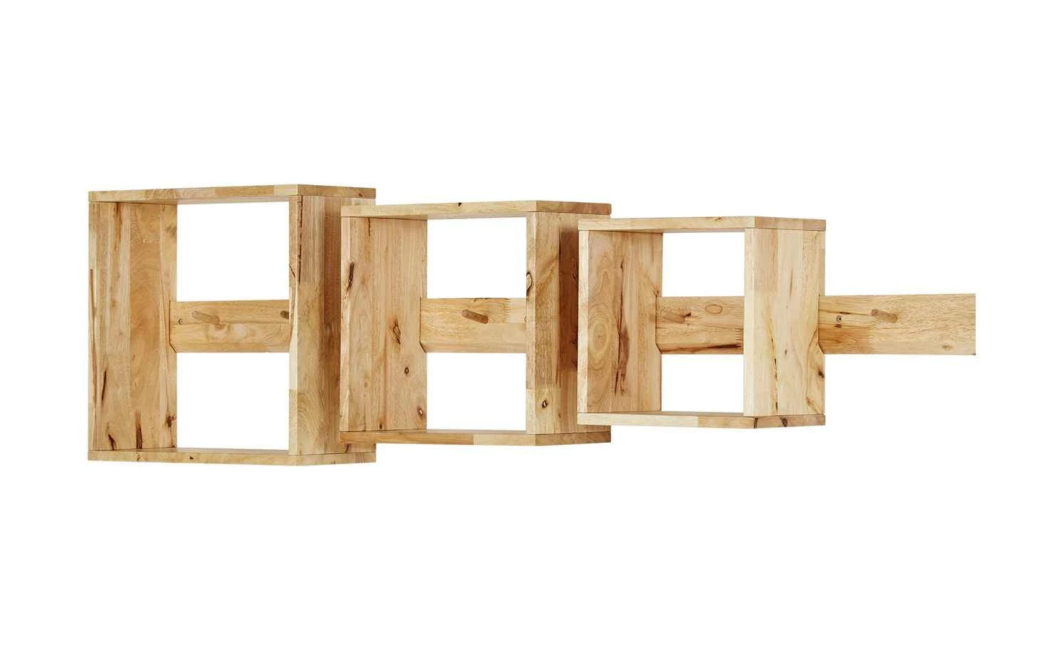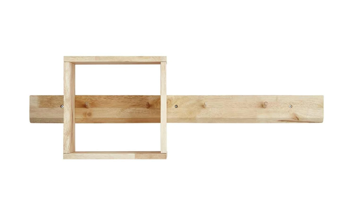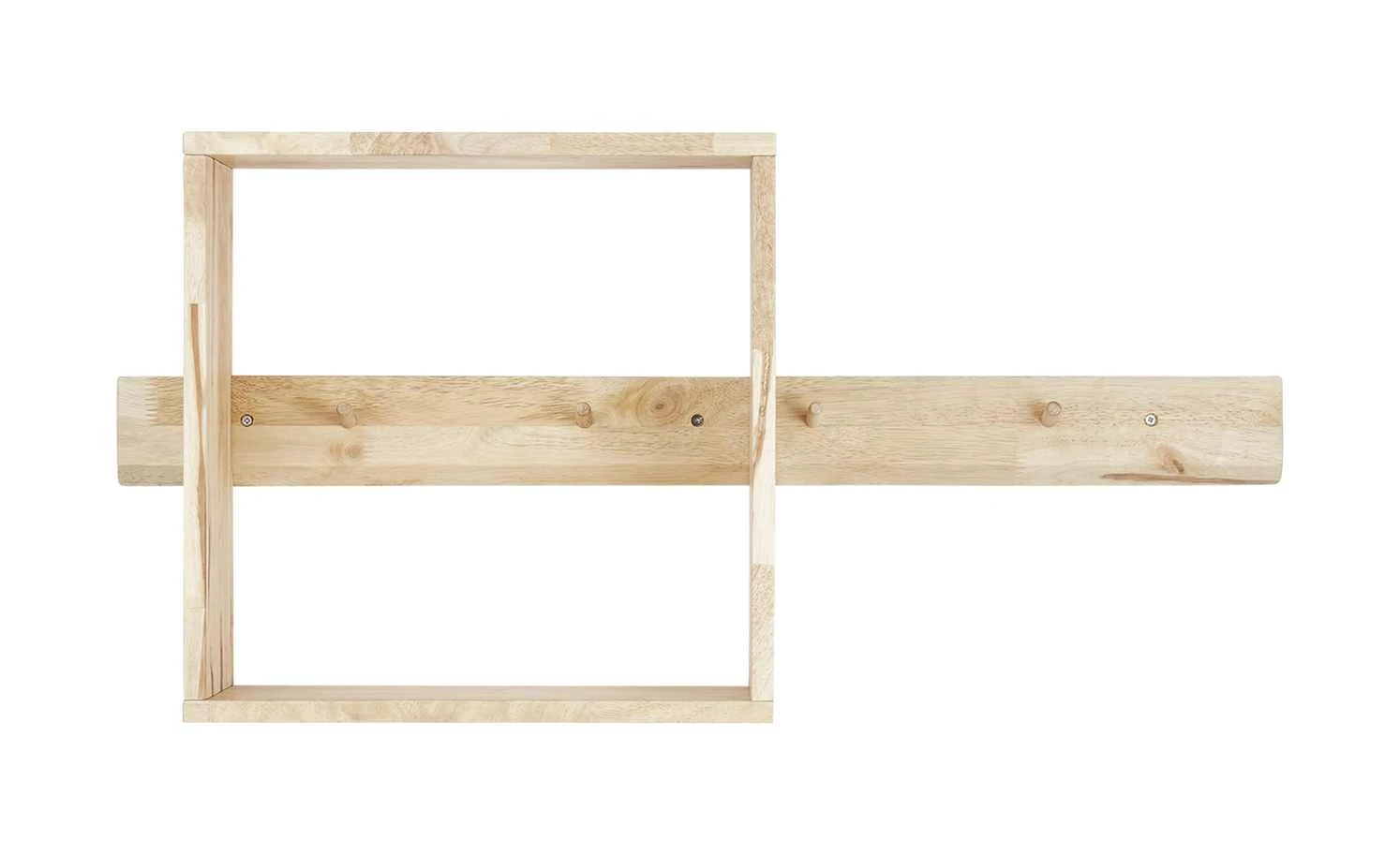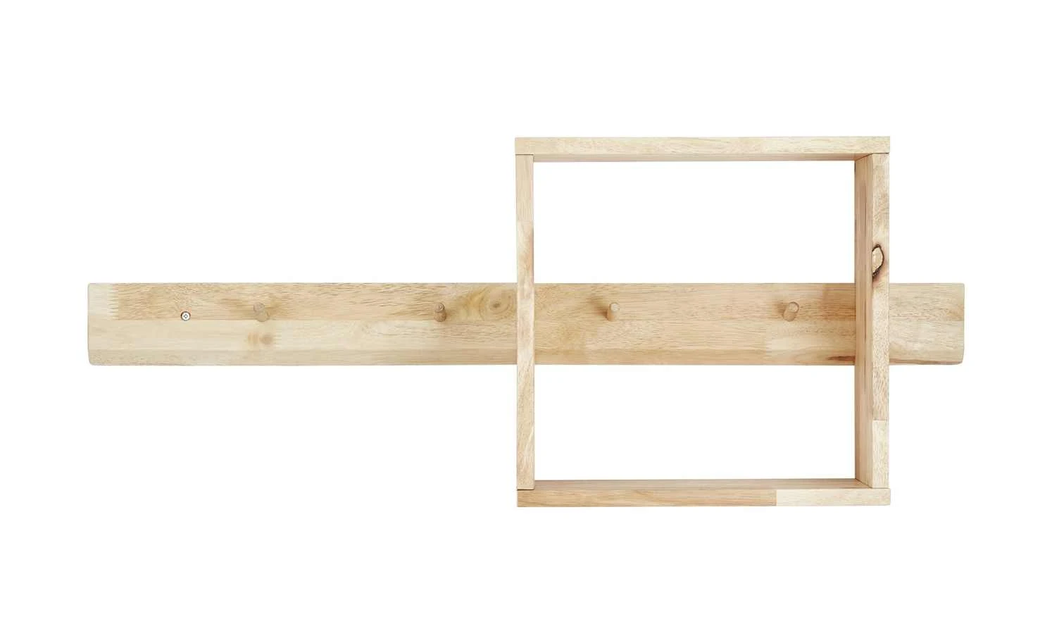 Nate bietet Ihnen stylischen Stauraum für die Wand. Zu dem Regal-Set gehören fünf Teile, die Sie ganz nach Bedarf kombinieren können. Im Lieferumfang enthalten sind zwei große Führungsleisten, acht Haken und drei quadratische Boxen. Diese können Sie nach Wunsch an die Leisten klemmen. Auch die Haken können einzeln oder in Kombination mit Boxen an der Leiste befestigt werden. Nate ist aus massivem Gummibaum. Für einen natürlichen Look wurde das Holz unbehandelt belassen.