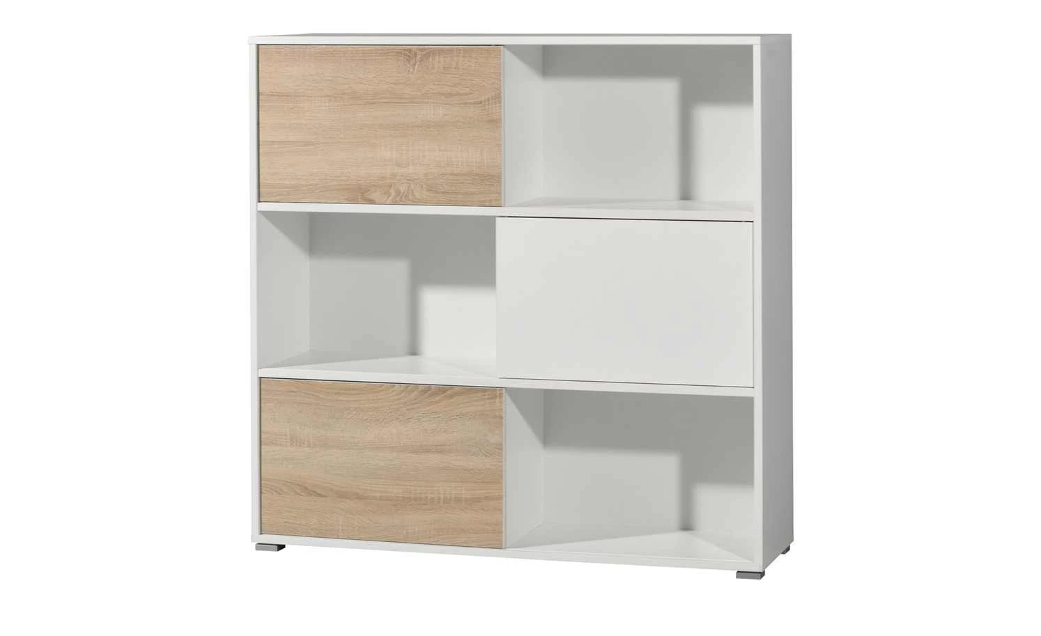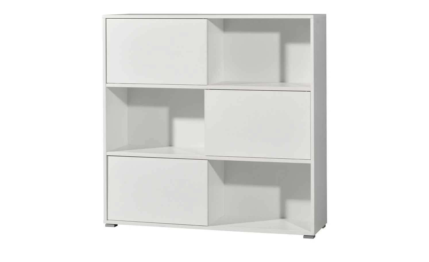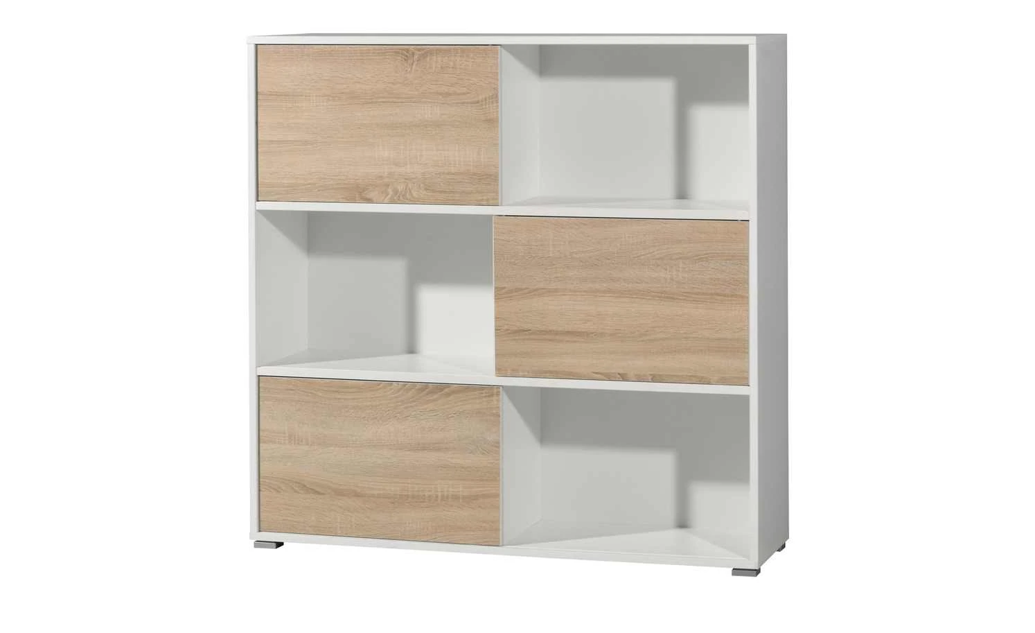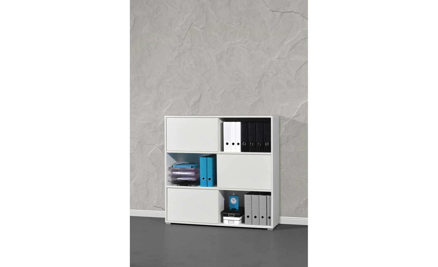. Zudem können Sie sie dorthin schieben, wo Sie gerne möchten. Durch das Hin- und Herschieben der Schranktüren können Sie beispielsweise die eine Hälfte des Regals als offenes Element nutzen und die andere als geschlossenen Schrank. Innen verfügt das Regal über sechs geräumige Fächer. Perfekt für Ordner oder Bücher.