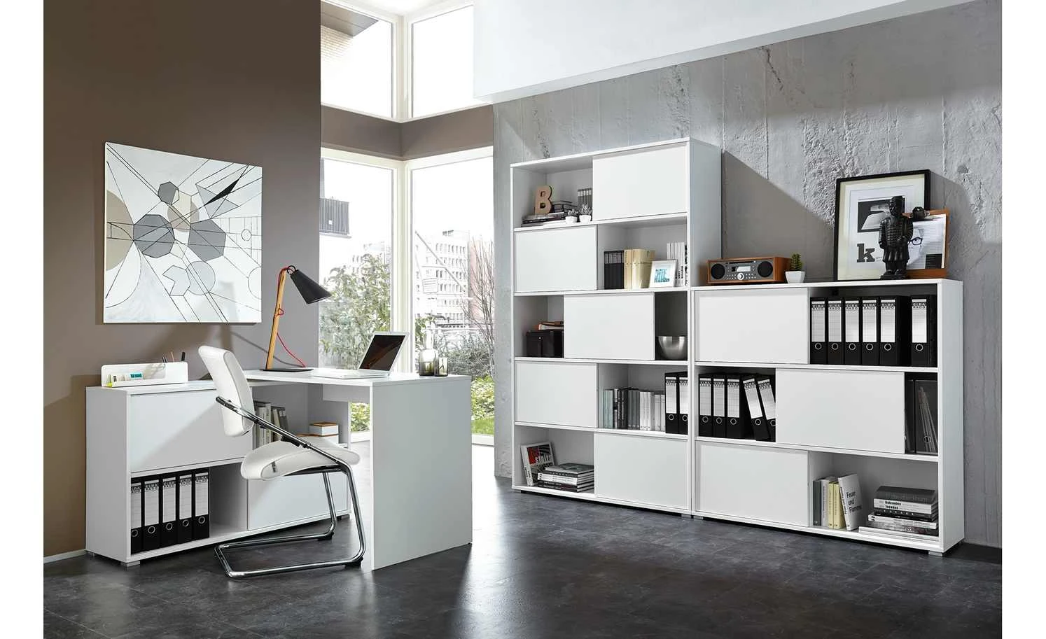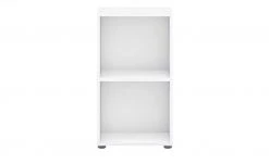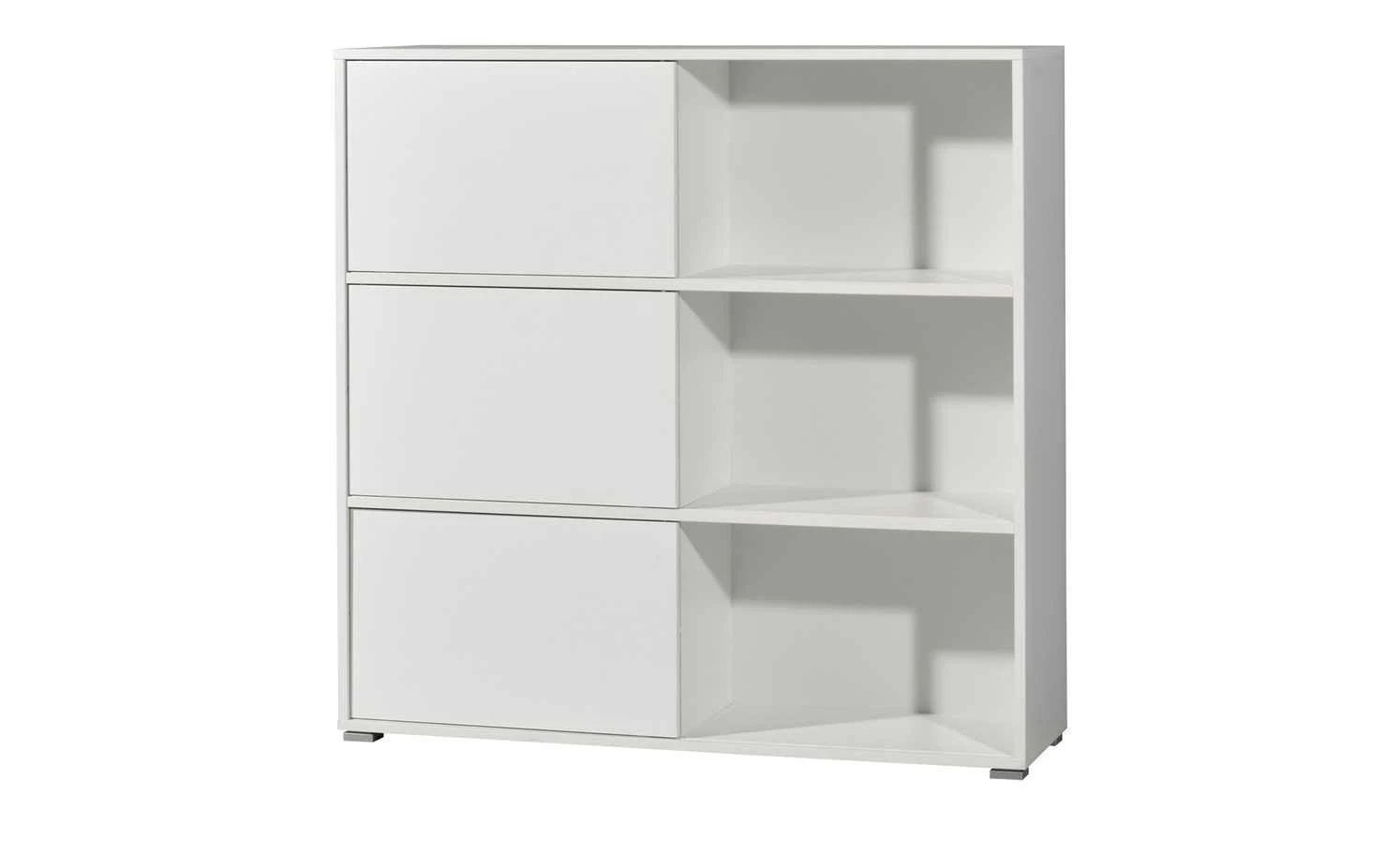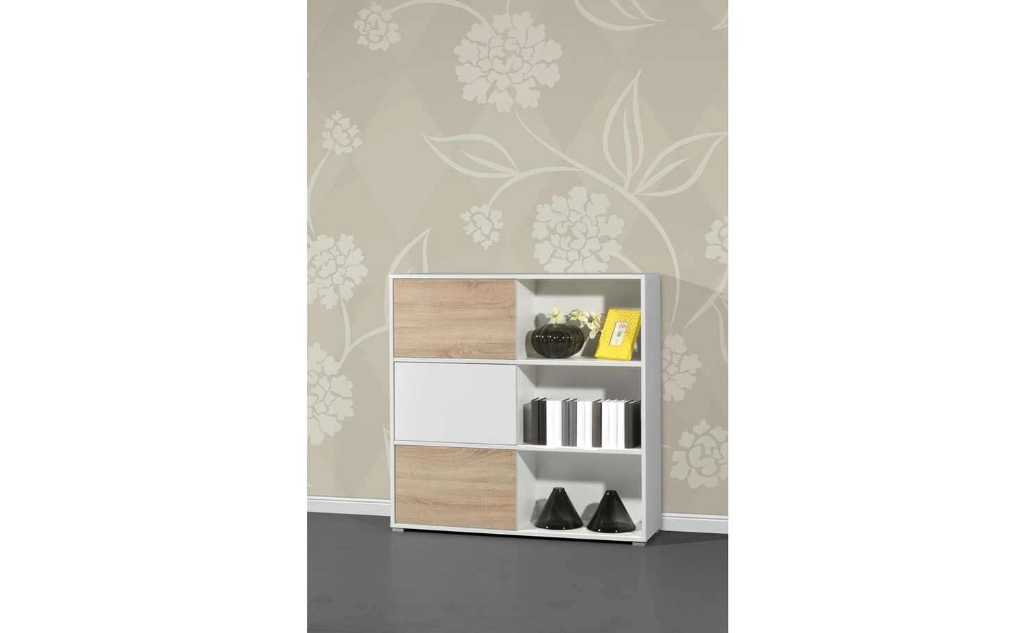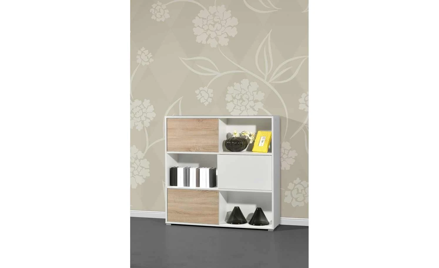. Zudem können Sie sie dorthin schieben, wo Sie gerne möchten. Durch das Hin- und Herschieben der Schranktüren können Sie beispielsweise die eine Hälfte des Regals als offenes Element nutzen und die andere als geschlossenen Schrank. Innen verfügt das Regal über sechs geräumige Fächer. Perfekt für Ordner oder Bücher.