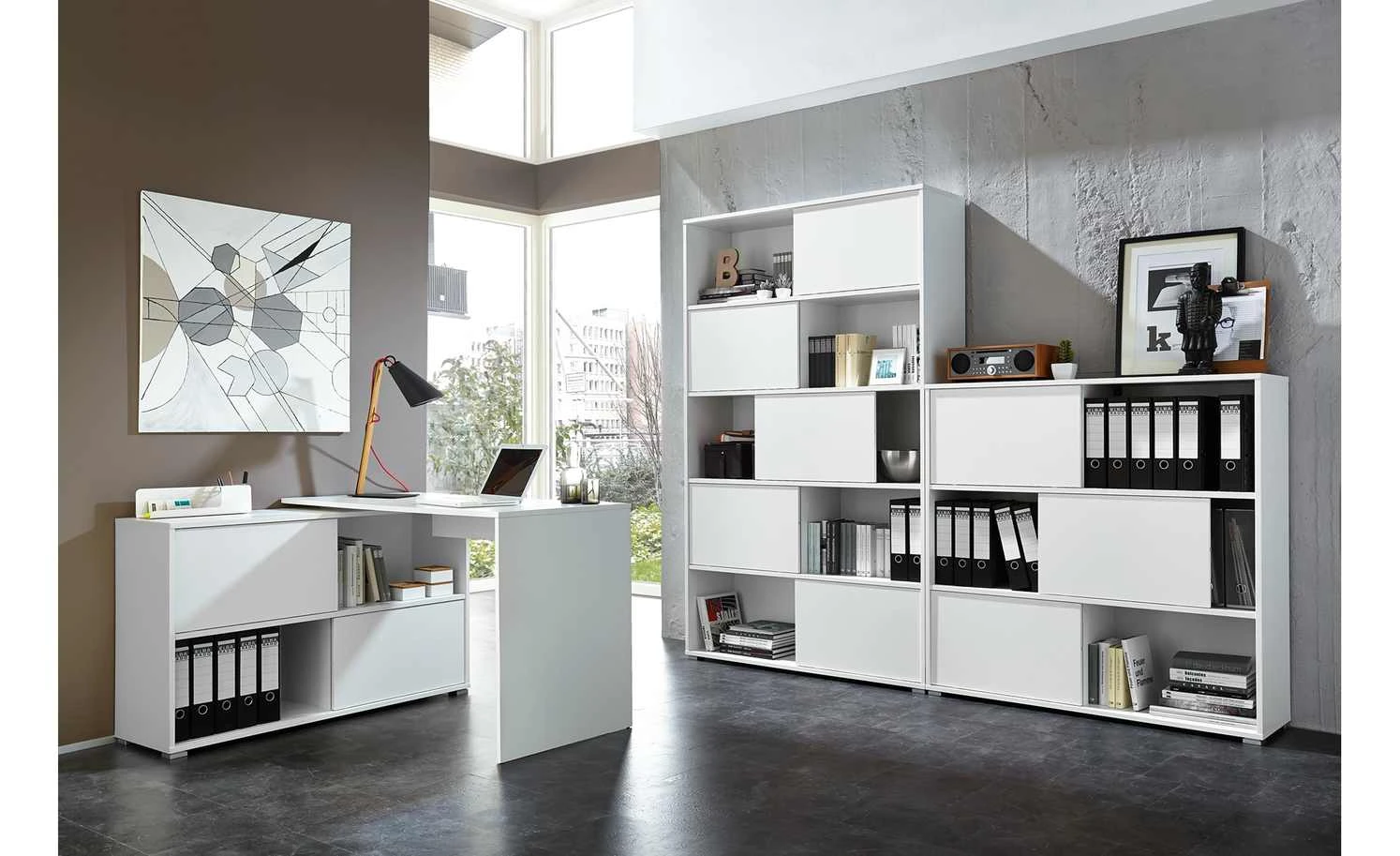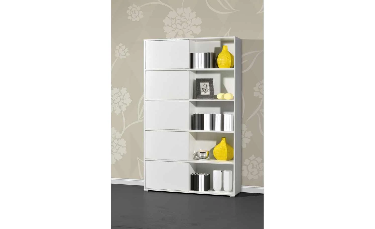 Mit diesem Schiebetürregal steht Ihnen ein flexibles Büromobiliar in einem zeitgemäßen Design zur Verfügung. Auf fünf ausladenden Böden bietet Ihnen das Regal reichlich Stellfläche für Aktenordner, Bücher oder sonstiges Büromaterial. Pfiffig ist das Konzept mit den fünf Schiebetüren, die immer nur die Hälfte einer Regalebene verdecken. Sie können nach Belieben positioniert werden und damit stets einen anderen optischen Eindruck entstehen lassen. Durch eine zusätzliche Wendeoption bieten die Türen zahlreiche Kombinationsmöglichkeiten. Das Schiebetürregal GW-Slide verkörpert mit seinen raffinierten Elementen und einem geradlinigen Design einen attraktiven, modernen Einrichtungsstil.