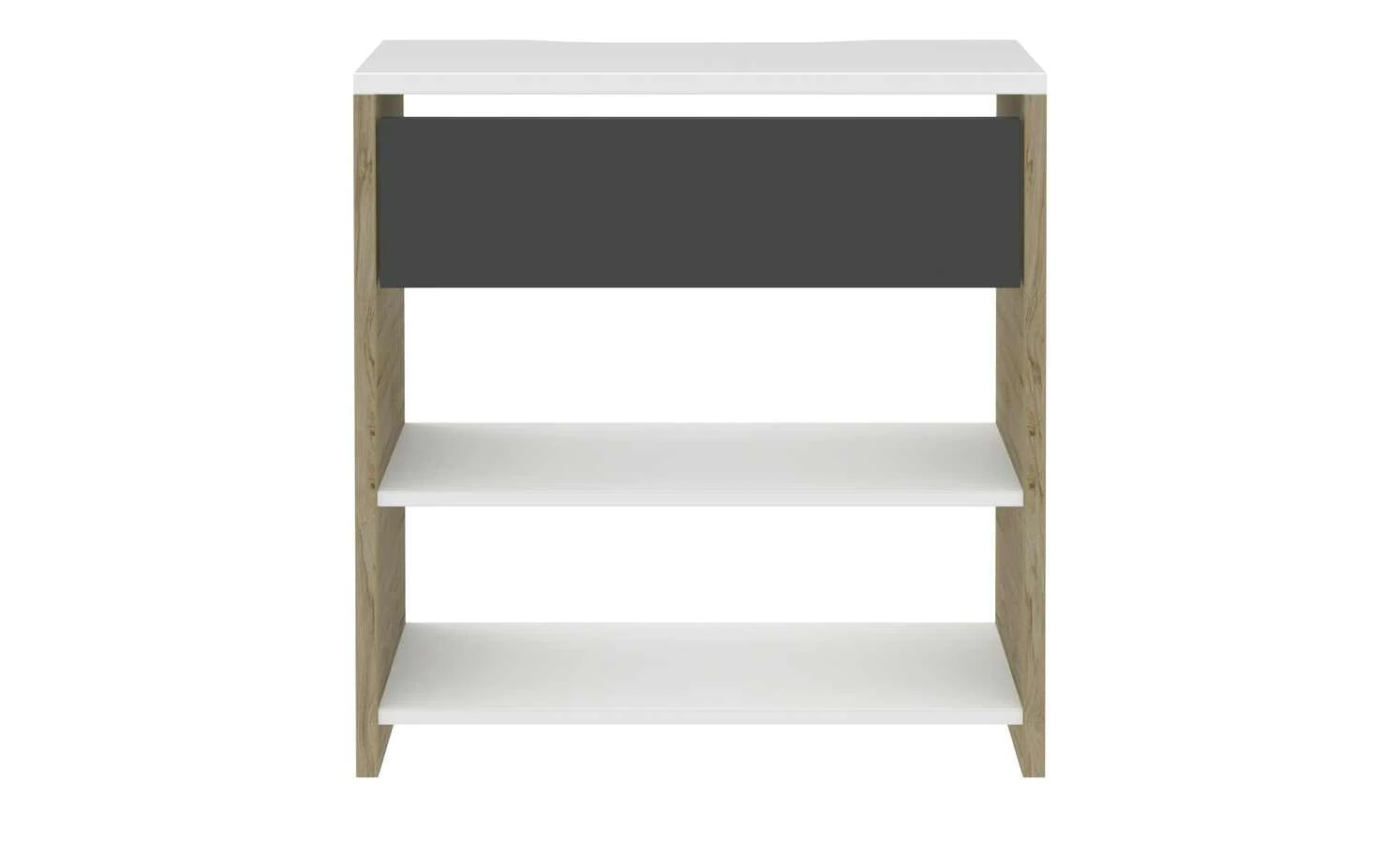 Das Regal Holly wird seitlich an den Schreibtisch angebracht. Es hat zwei offenes Fächer – sowie ein weiteres Fach, das durch eine Klappe geschlossen wird. Auf der Rückseite befindet sich eine Aussparung, durch die Sie Kabel führen können.