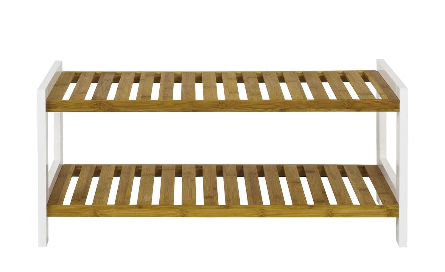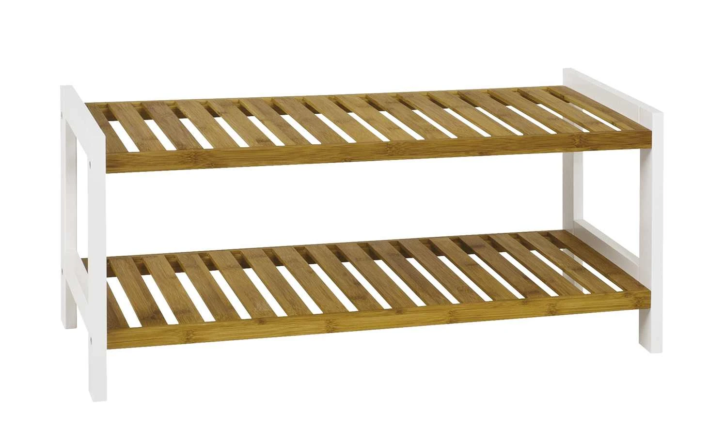 Lenka ist ein praktisches Schuhregal, das sich gut im Flur macht. Auf den beiden Schuhrosten können etwa sechs Paar Schuhe abgestellt werden. Die Ablagen sind aus massivem Bambusholz gefertigt und lackiert. Das Gestell setzt sich in Weiß ab.