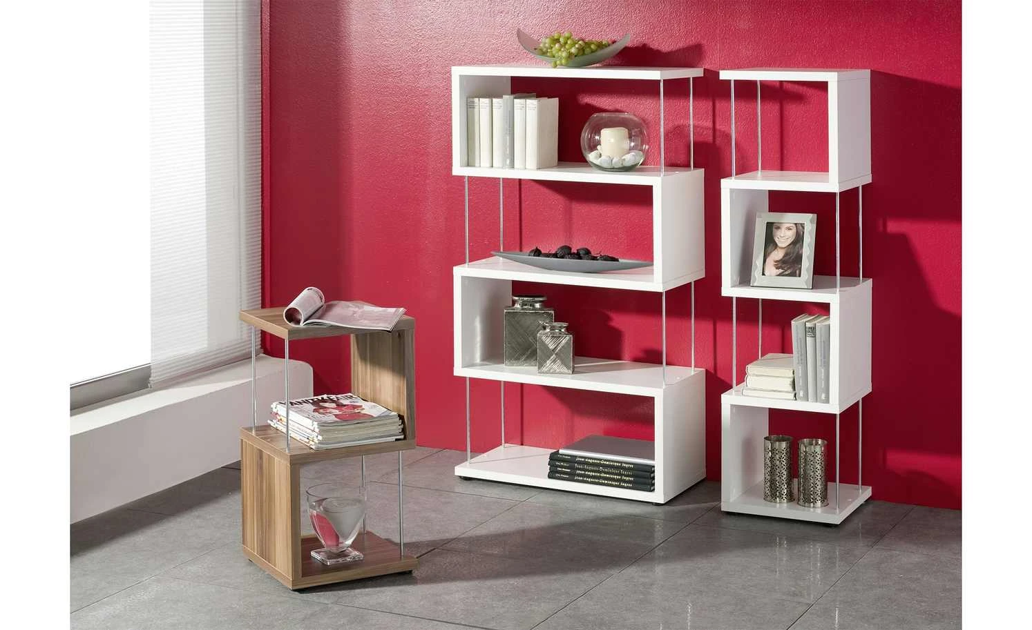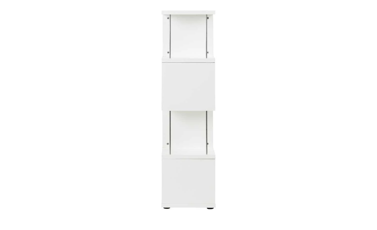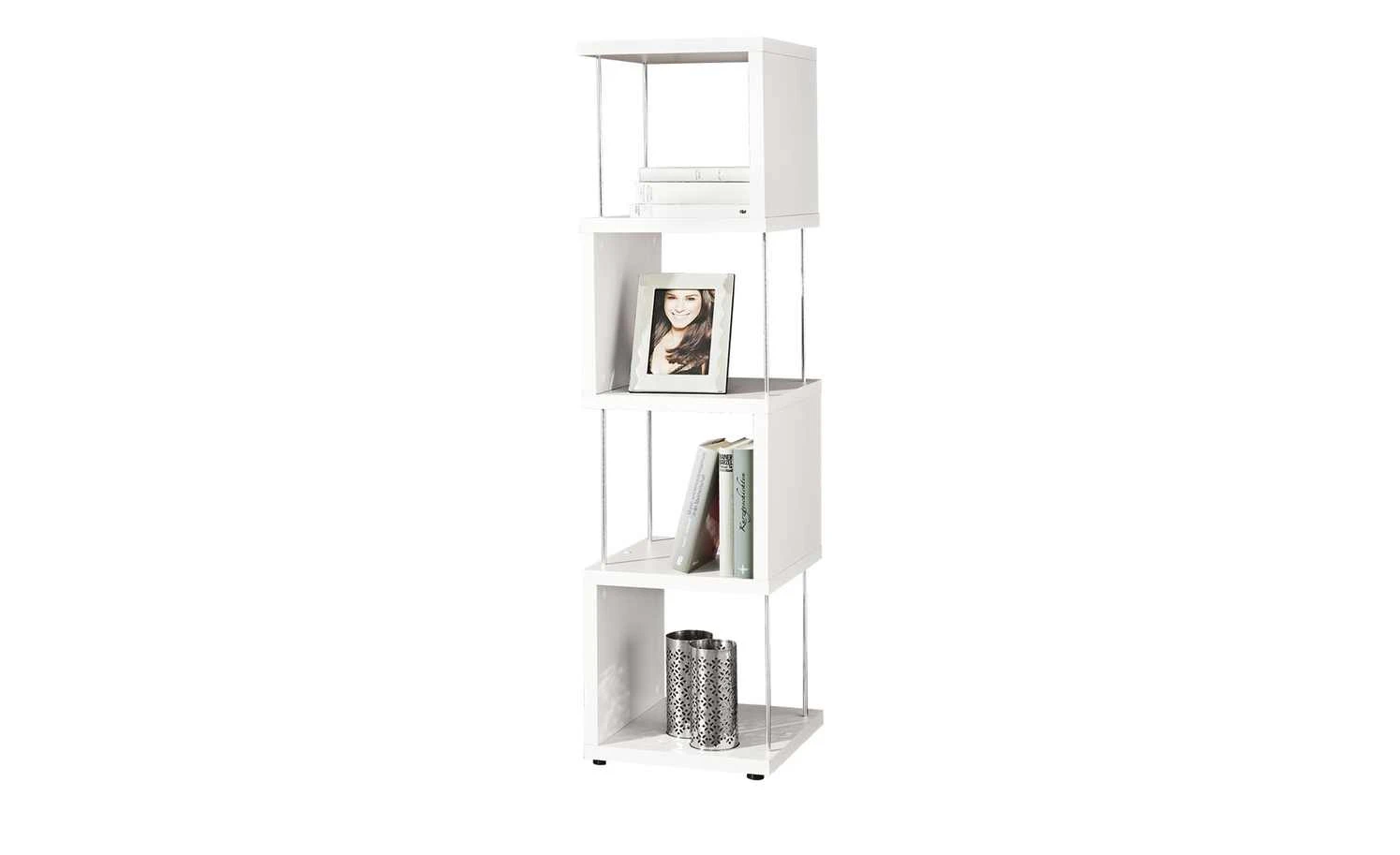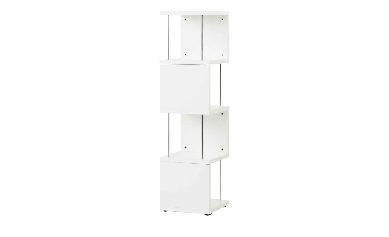 S-förmig angeordnete, quadratische Platten mit Kunststoffoberfläche setzen sich zu einem ansprechenden schlanken Regal zusammen. Die auf diese Weise entstehenden Ablagefächer werden mit je zwei dünnen Metallstäben an der offenen Seite stabilisiert. Die fünf waagerechten Elemente bilden praktische Ablageflächen für Bücher, dekorative Kartons und Schalen, Bilderrahmen und Vieles mehr. Unter dem zierlichen Regal sorgen flache schwarze Füße für einen guten Stand.