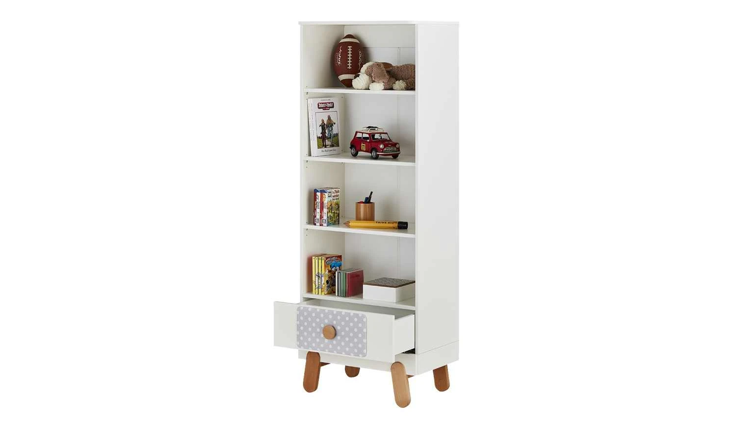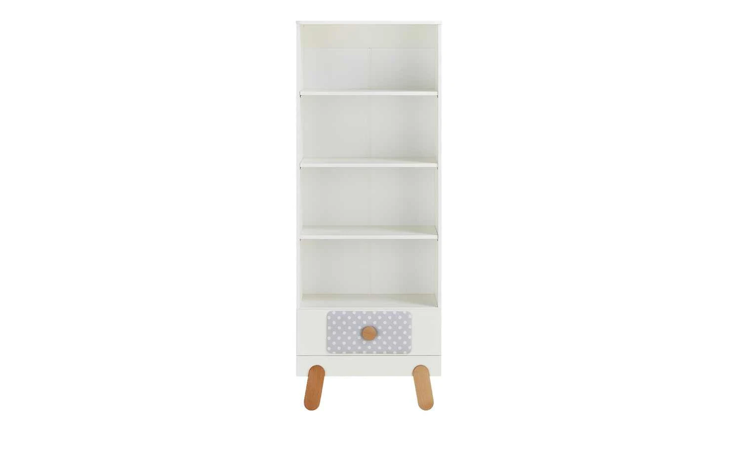 Mit seinen vier Fächern ist das Standregal Irma perfekt für Kinderbücher oder Spielzeug. Es kann aber auch gut mit Ordnungsboxen ergänzt werden. Zusätzlich zu den Fächern hat es eine Schublade mit Soft-Close im unteren Bereich. Irmas weiße Oberflächen sind melaminbeschichtet und deshalb kratzerunempfindlich. Griffe und Füße setzen sich ab, sie bestehen aus massiver Buche.