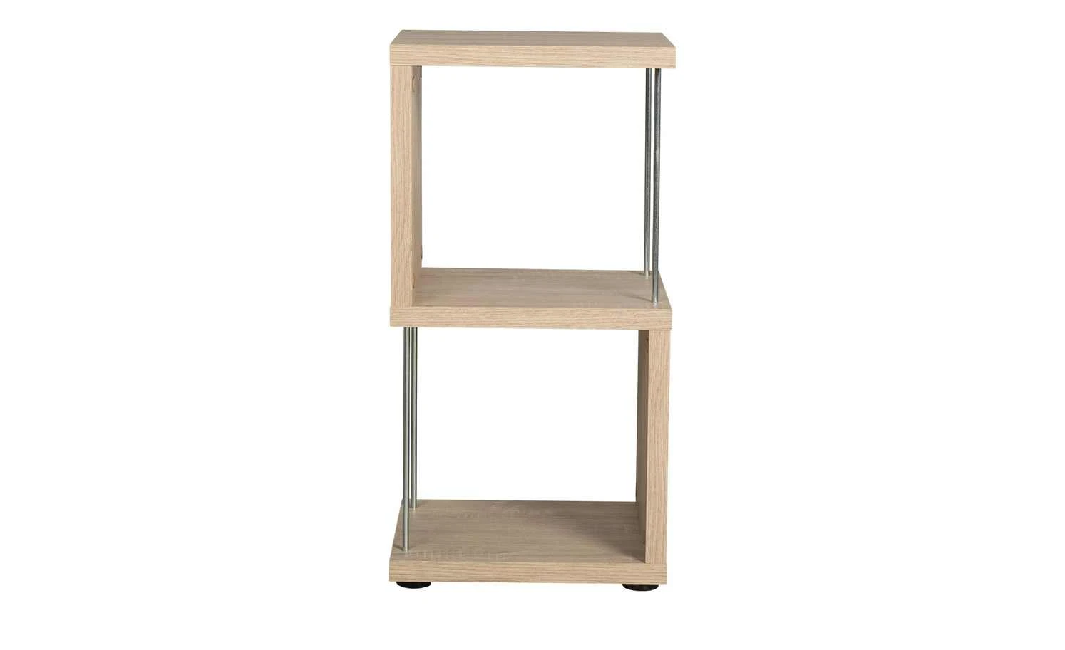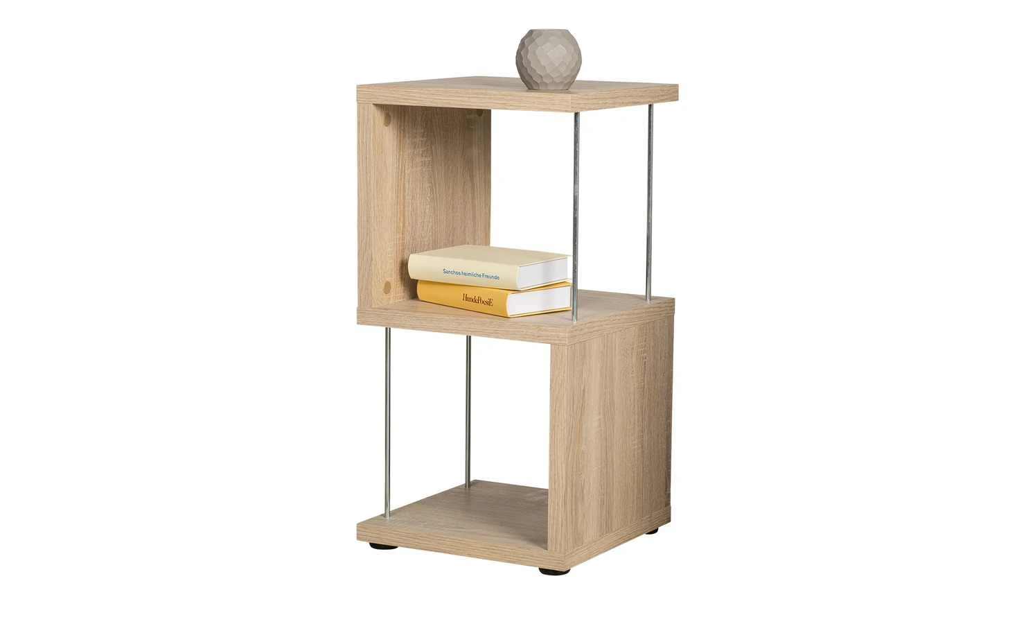 Dieses Standregal mit zwei Ablagefächern erhält seine Leichtigkeit und interessante, S-förmige Optik durch die Kombination von Plattenmaterial und verchromten Metallstreben. Bilderrahmen, Bücher und Vieles mehr lassen sich so in Szene setzen.