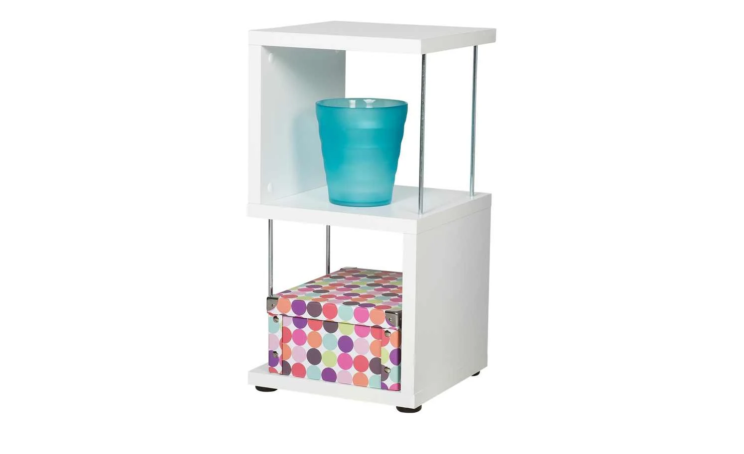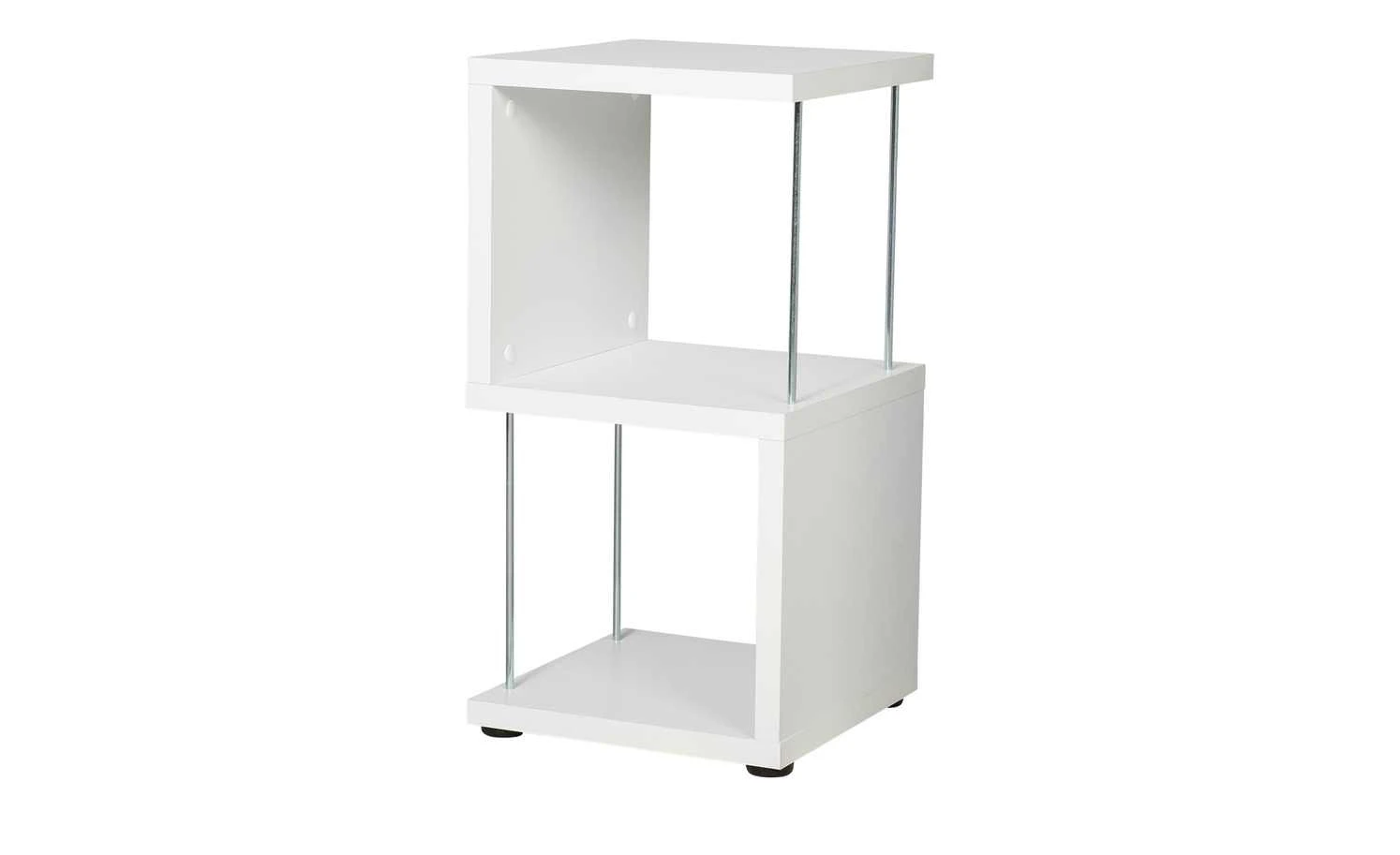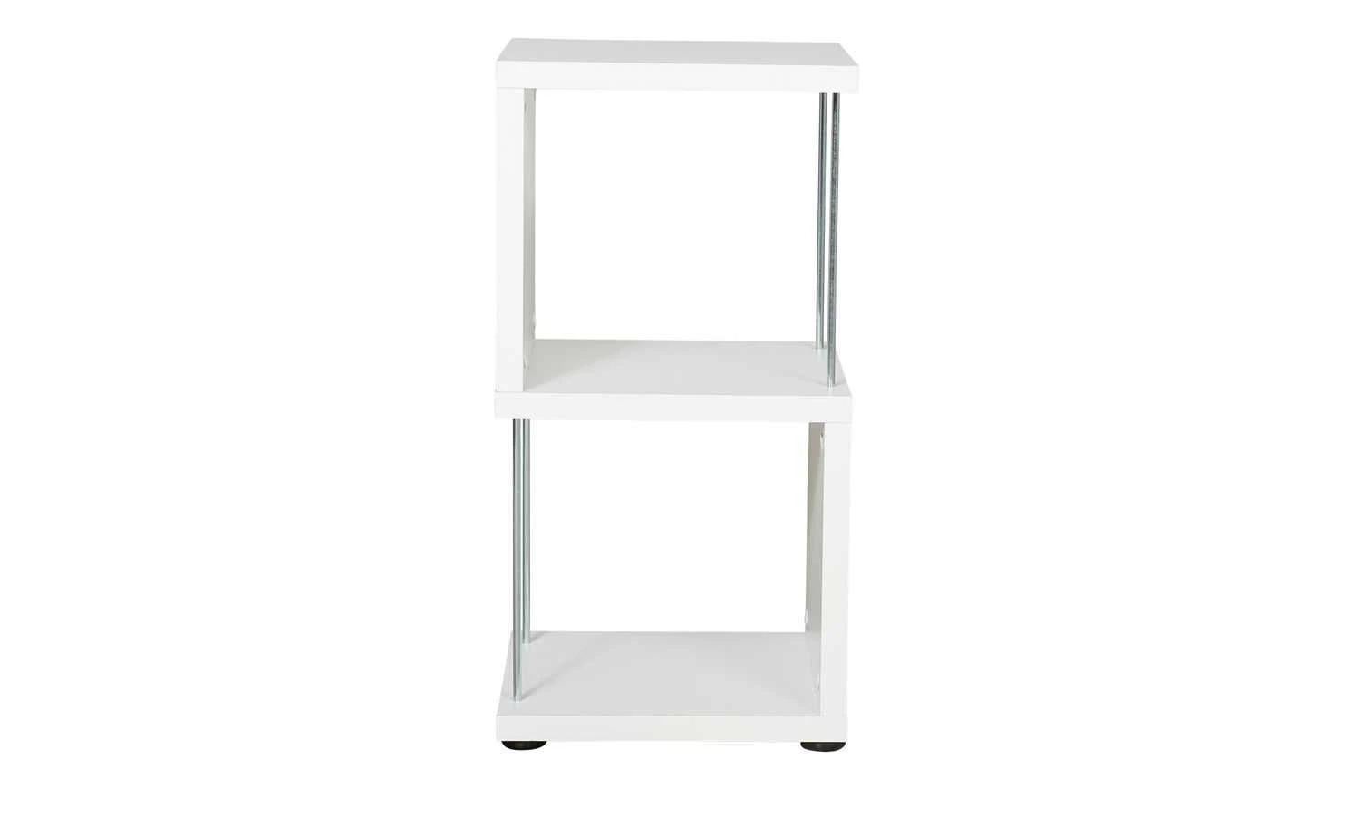 Dieses Standregal mit zwei Ablagefächern erhält seine Leichtigkeit und interessante, S-förmige Optik durch die Kombination von Plattenmaterial und verchromten Metallstreben. Bilderrahmen, Bücher und Vieles mehr lassen sich so in Szene setzen.