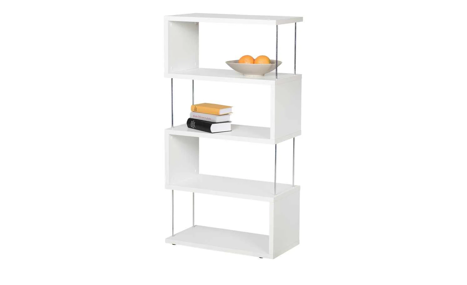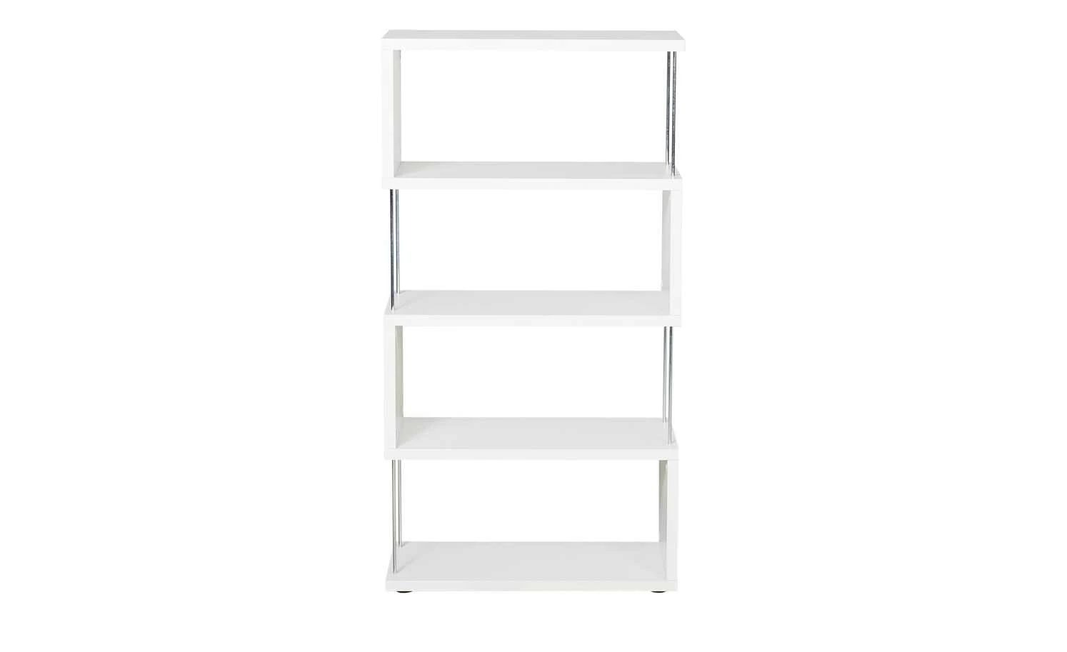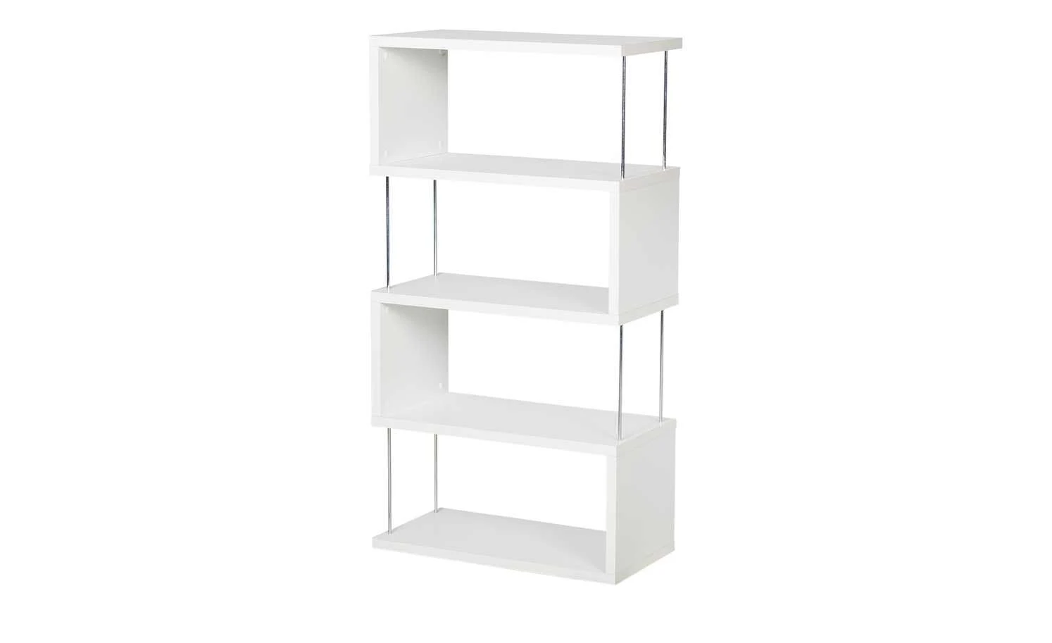 S-förmig angeordnete Platten mit Kunststoffoberfläche setzen sich zu einem charmanten Regal zusammen. Die auf diese Weise entstehenden Ablagefächer werden mit je zwei dünnen Metallstäben an der offenen Seite stabilisiert. Die fünf breiten waagerechten Elemente bilden praktische Ablageflächen für Bücher, dekorative Kartons und Schalen, Bilderrahmen und Vieles mehr.