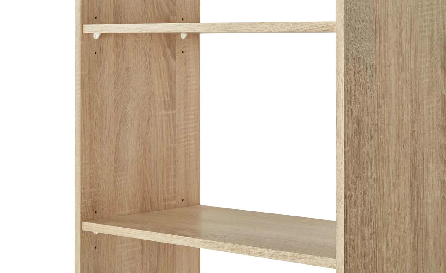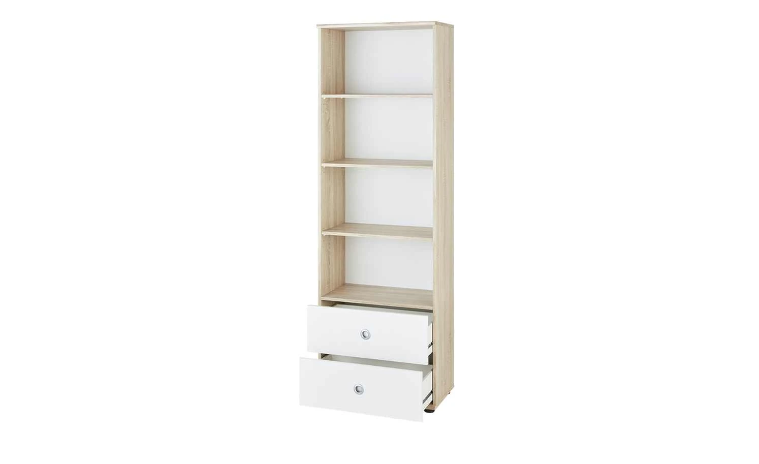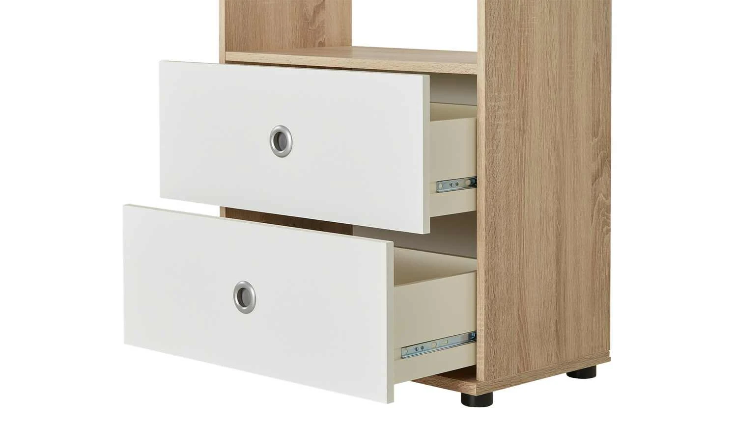 Vier offene Fächer hat das Standregal Wiki. Zusätzlich können Sie zwei Schubfächer nutzen. Korpus und Böden in Eiche Sonoma (Nachbildung) werden durch die weißen Schübe abgesetzt. Sie können Wiki wunderbar für Kinderbücher und Spielwaren nutzen.