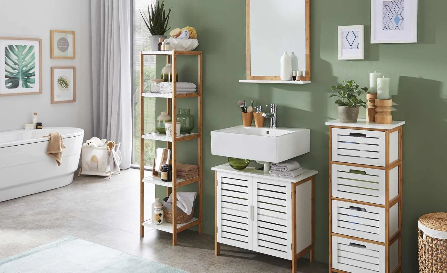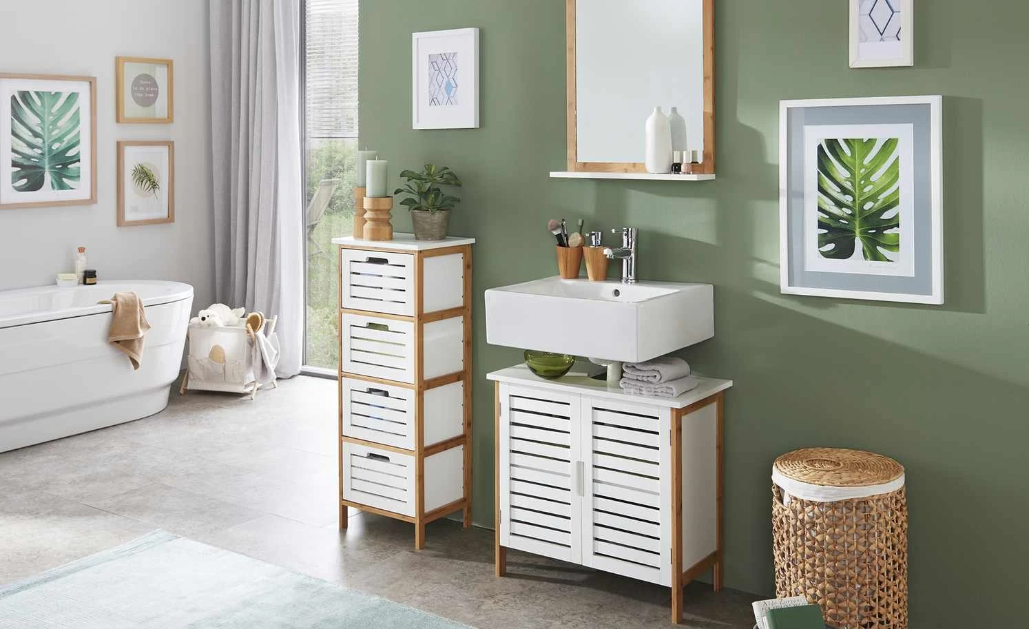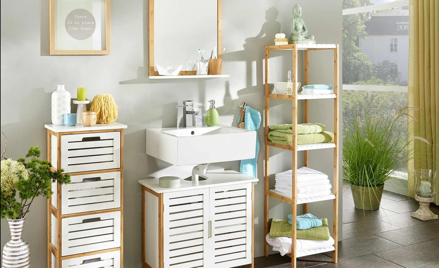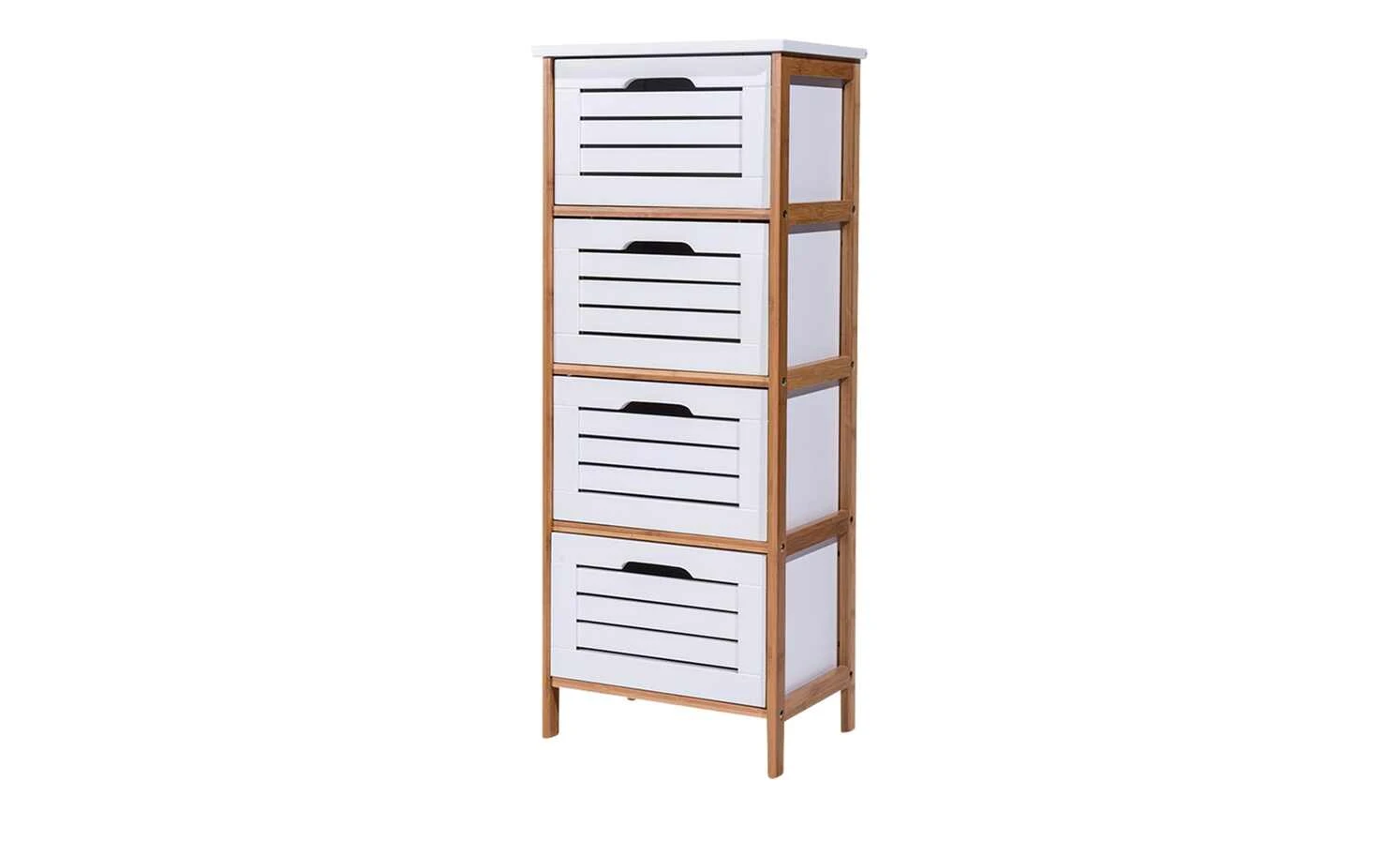 Das Badregal Clio wird mit vier praktischen Ordnungsboxen geliefert, die genau in die Regalfächer passen. Sie lassen sich leicht herausziehen und befüllen. Nutzen Sie sie für Handtücher, Pflegeartikel und Co. Abdeckplatte und Boxen sind weiß lackiert. Gestell und Regalböden setzen sich ab; sie bestehen aus massivem Bambus.