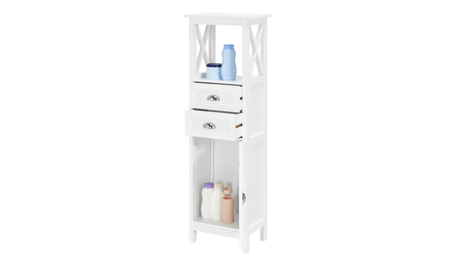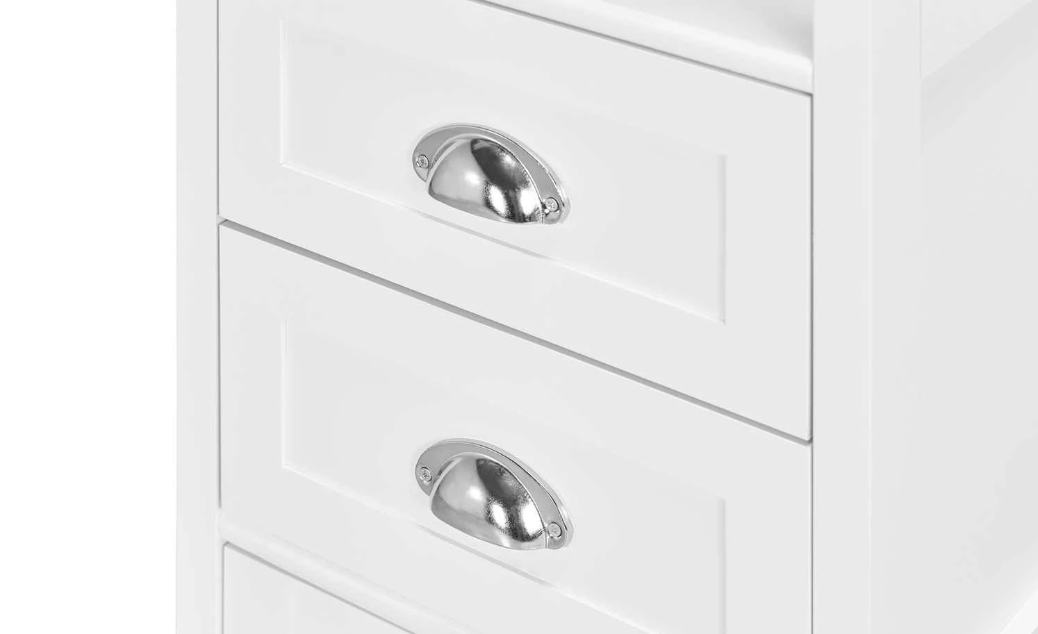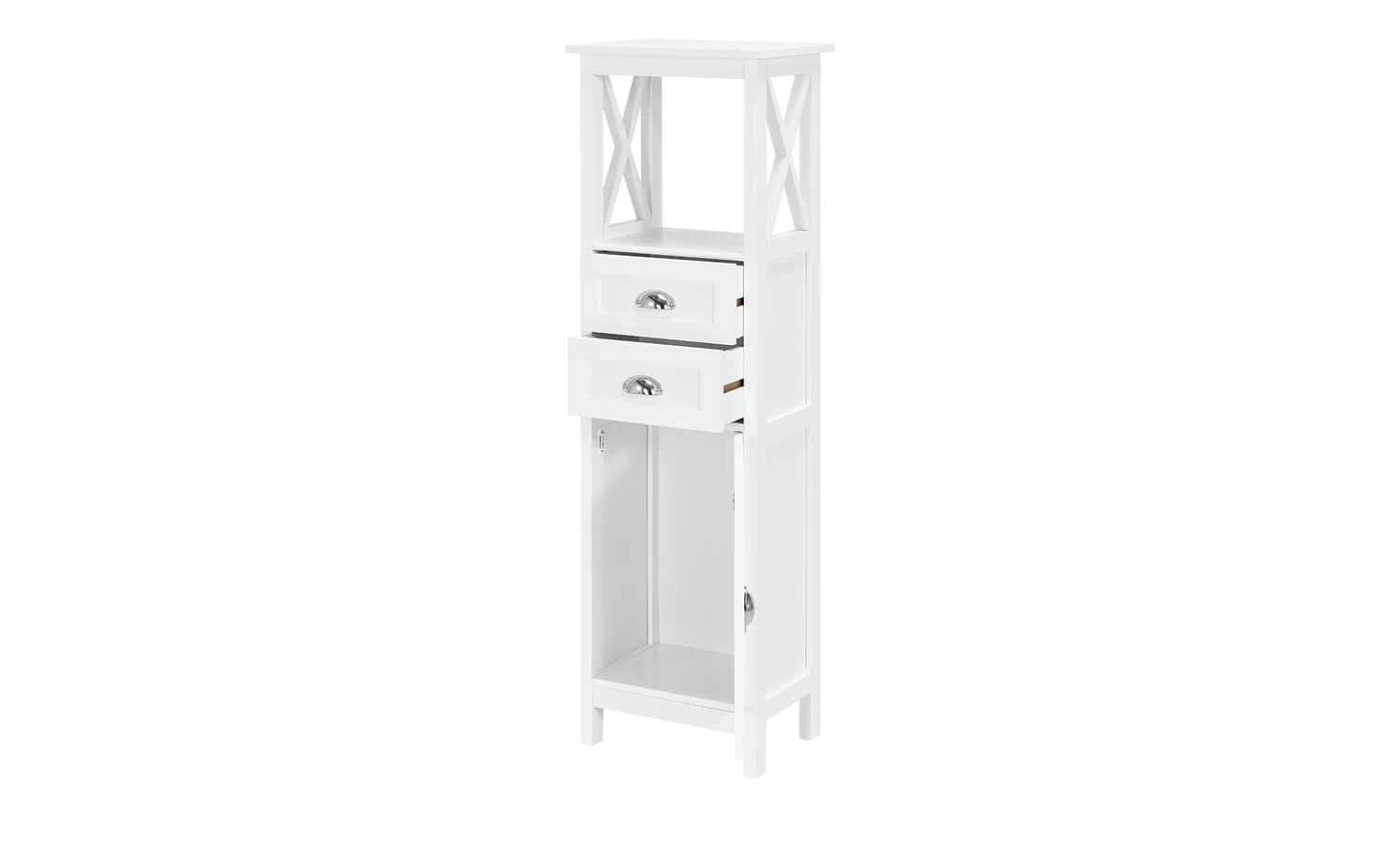 Mit der Serie Mosi zieht der Landhausstil in Ihre Badezimmer. Dieses praktische Badregal ist toll unterteilt. Es hat ein offenes Fach. Darunter stehen Ihnen zwei Schubladen und ein Fach mit Tür zur Verfügung. Eyecatcher sind die x-förmigen Streben an den Seiten. Die Metallgriffe im Apothekerstil setzen glänzende Akzente.