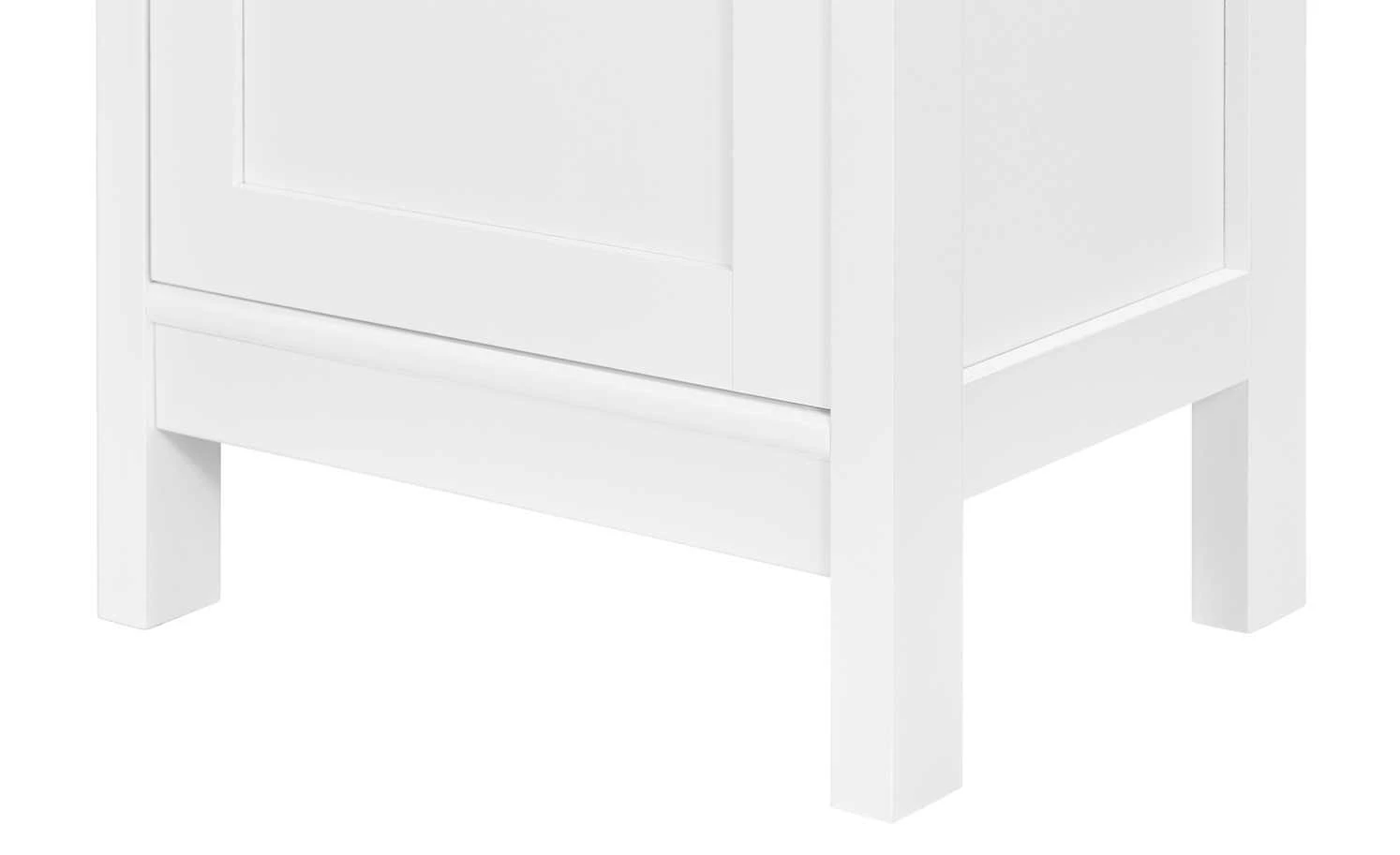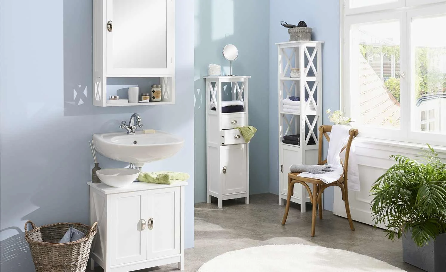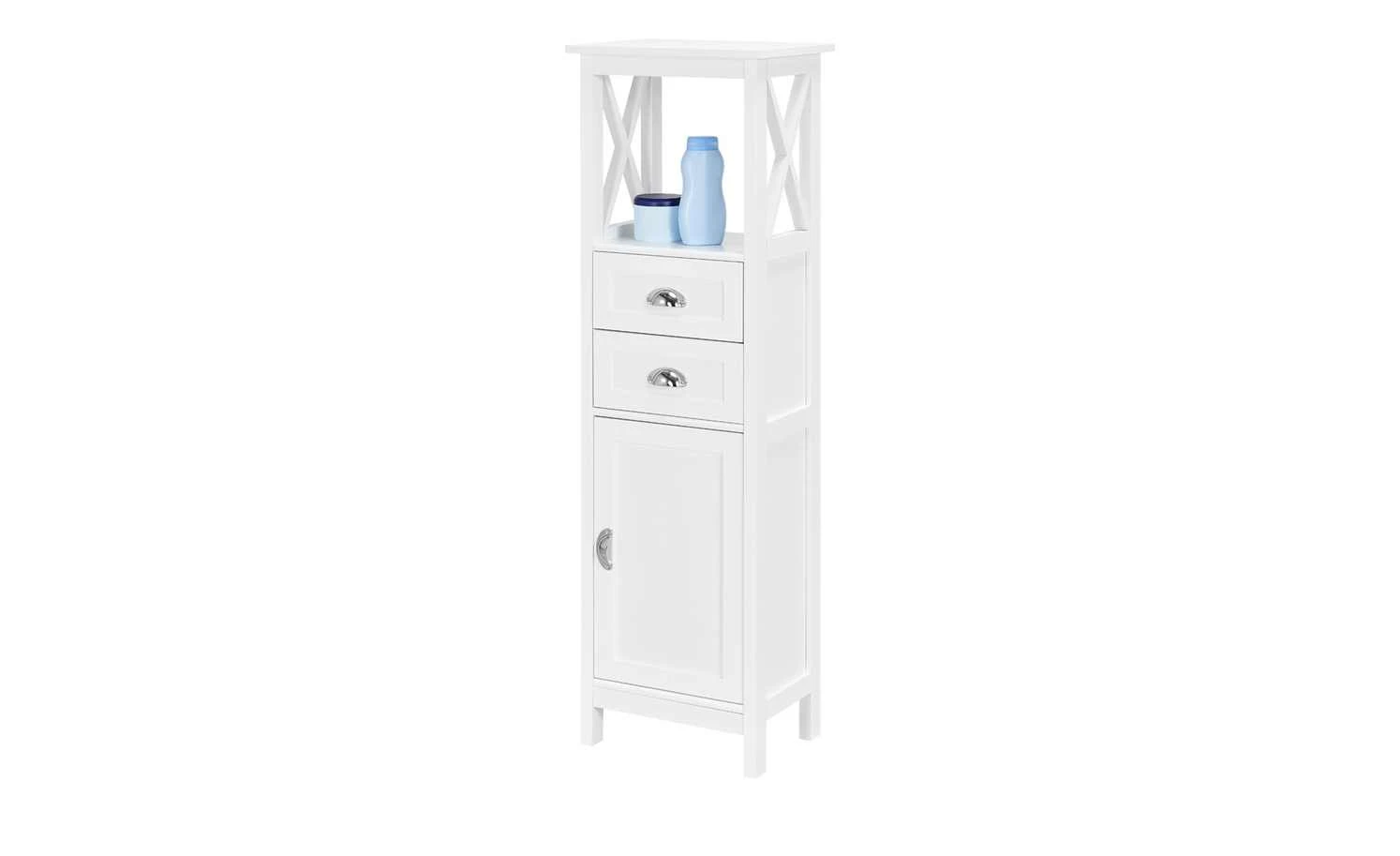 Mit der Serie Mosi zieht der Landhausstil in Ihre Badezimmer. Dieses praktische Badregal ist toll unterteilt. Es hat ein offenes Fach. Darunter stehen Ihnen zwei Schubladen und ein Fach mit Tür zur Verfügung. Eyecatcher sind die x-förmigen Streben an den Seiten. Die Metallgriffe im Apothekerstil setzen glänzende Akzente.