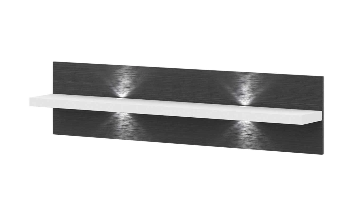 Mit dem Wandboard Titan von uno verschönern Sie die Wand und schaffen zugleich eine Staumöglichkeit. Während der Boden in einem dezenten Weiß designt ist, setzt sich die Rückwand in Graphit (Nachbildung) ab. Das Besondere daran: Die Oberfläche hat eine geschroppte, also geriffelte Oberfläche. Da sie mit Licht noch besser zur Geltung kommt, wird Titan mit Beleuchtung geliefert. Dabei handelt es sich um vier LED-Einbauleuchten am Regalboden.