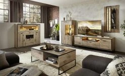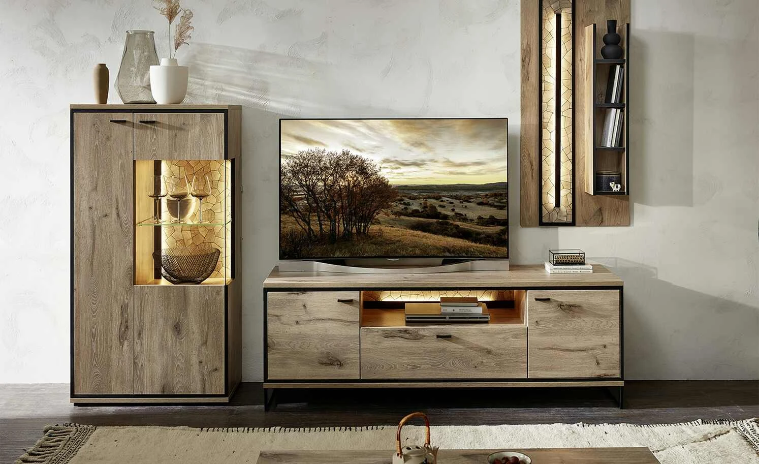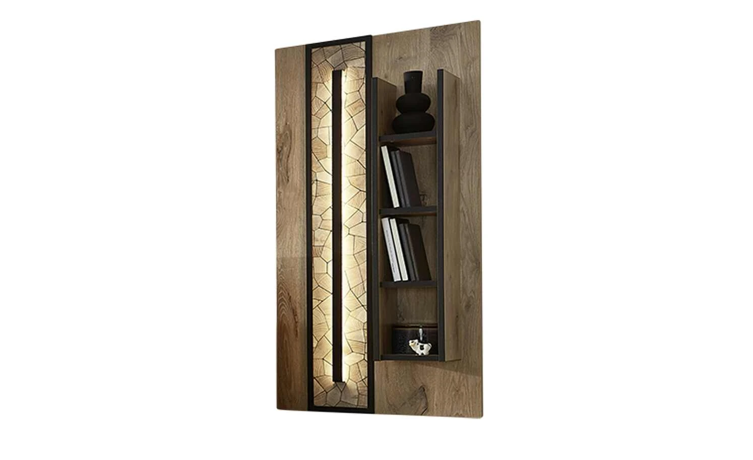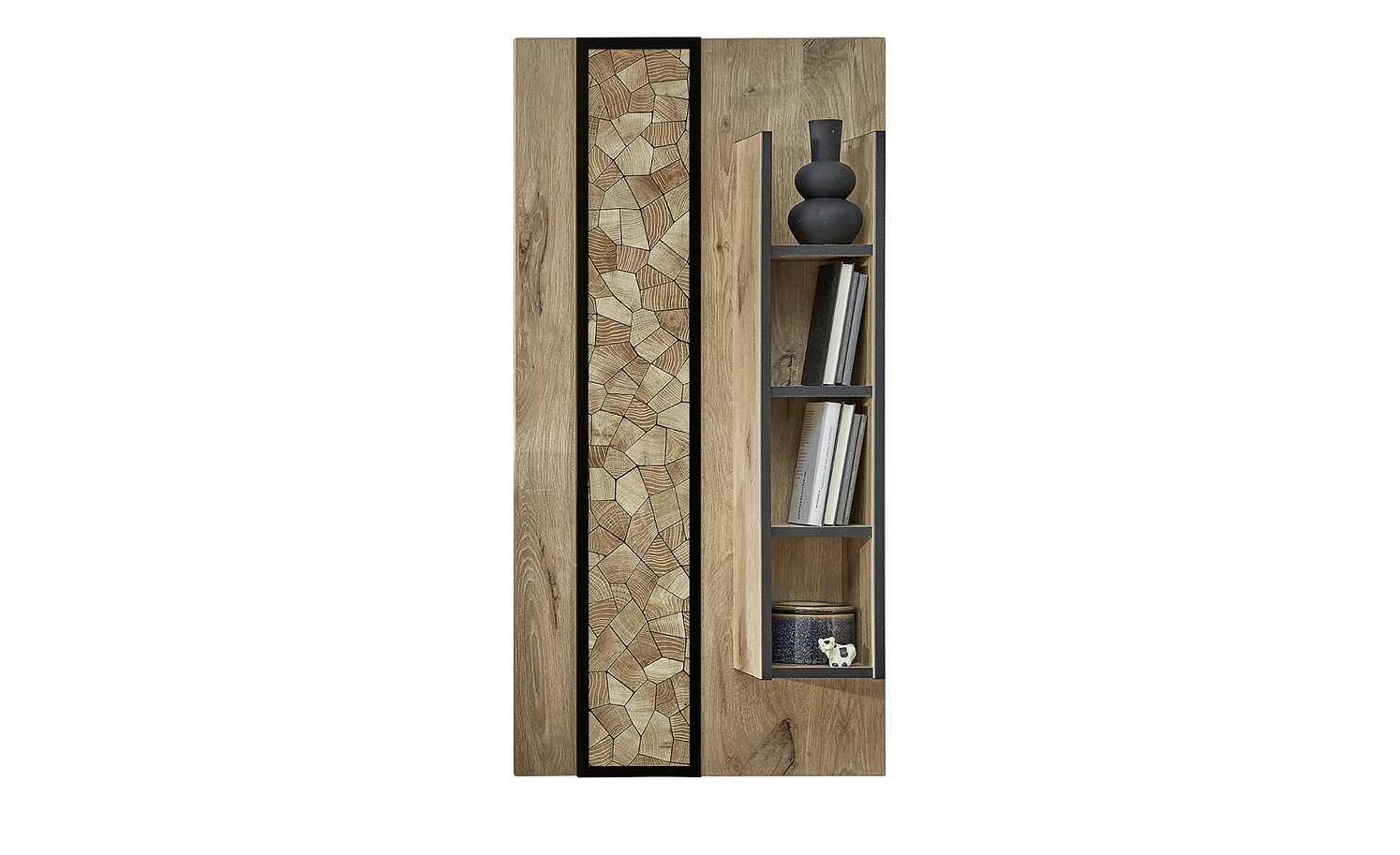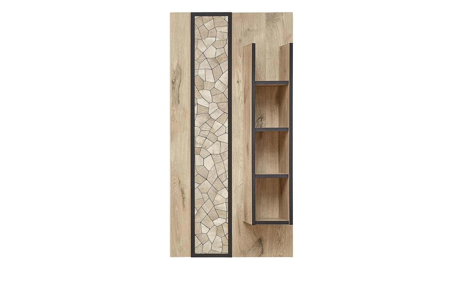 - Mehr zum Material: Absetzung aus Holzwerkstoff foliert in Hirnholz Moasik Optik (Nachbildung), Schwarz matt umrandet, Paneel und Regal aus Holzwerkstoff foliert in Viking Oak Nature (Eiche Nachbildung)