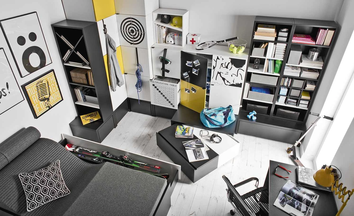 Das Wandregal Young Users besteht aus zwei Teilen. Sie sind durch eine Schräge voneinander getrennt. Die beiden Regalelemente können Sie zusammen platzieren, so dass Sie direkt übereinander sind. Sie können sie aber auch getrennt platzieren.