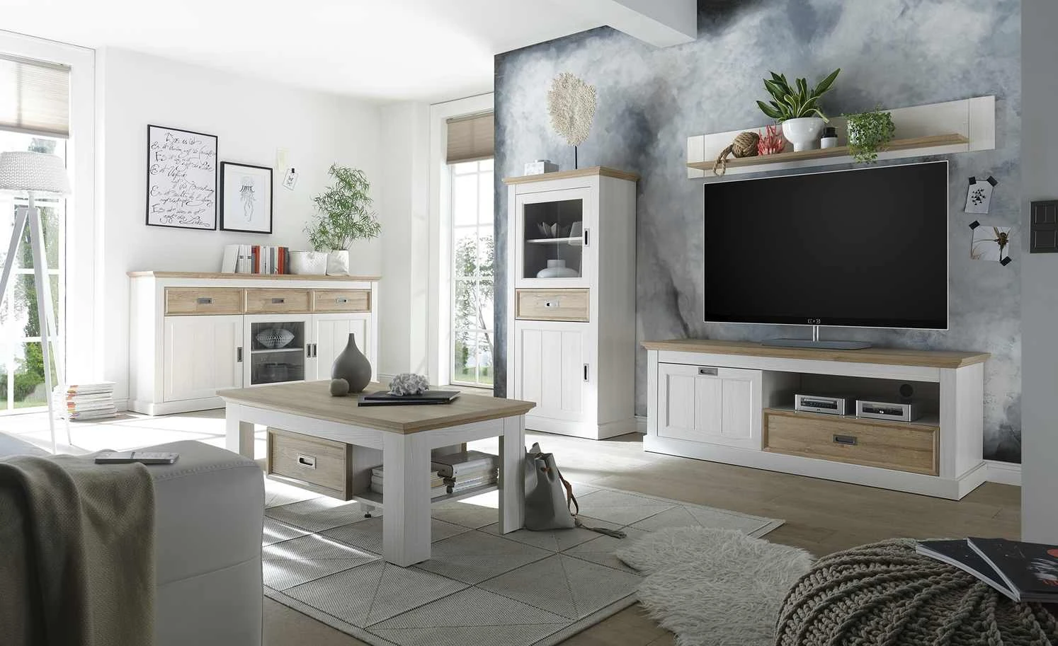 Das Wandboard Benevent ergänzt die gleichnamige Serie. Es kann zum Beispiel wunderbar oberhalb des Sideboards platziert werden. Das Board ist 155 Zentimeter lang und bietet somit viel Stellfläche. Ideal für Fotos oder Bücher. Das Paneel ist in Eiche Weiß (Nachbildung) gehalten und wird vom Boden in Wildeiche (Nachbildung) abgesetzt.