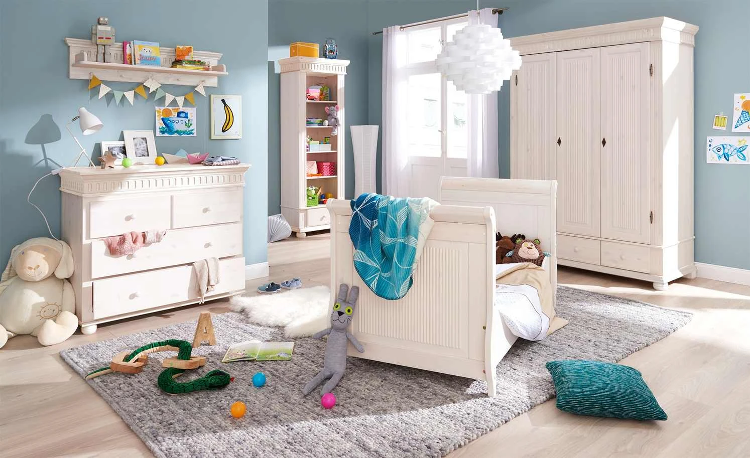 Im Babyzimmer macht sich das Wandboard Bornholm gut – zum Beispiel oberhalb der Wickelkommode. Das Board selbst bietet viel Stellfläche für Babypflegeartikel. Strampler und Mützchen können Sie an die Kleiderhaken hängen. Gleich fünf sind vorhanden. Bornholm ist komplett aus massiver Kiefer gefertigt und weiß gewachst.