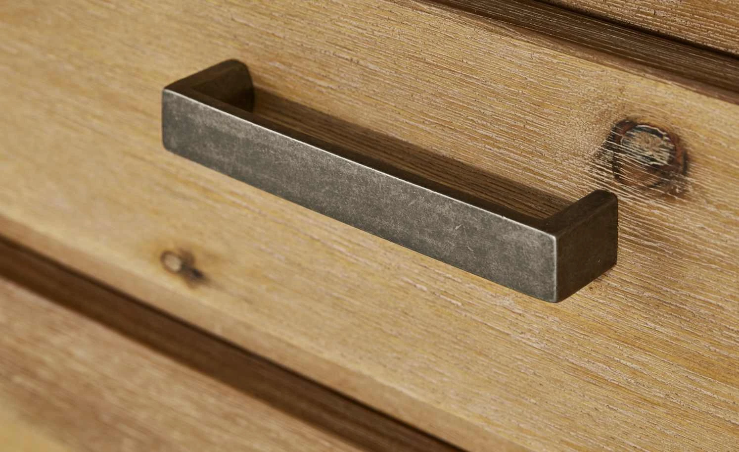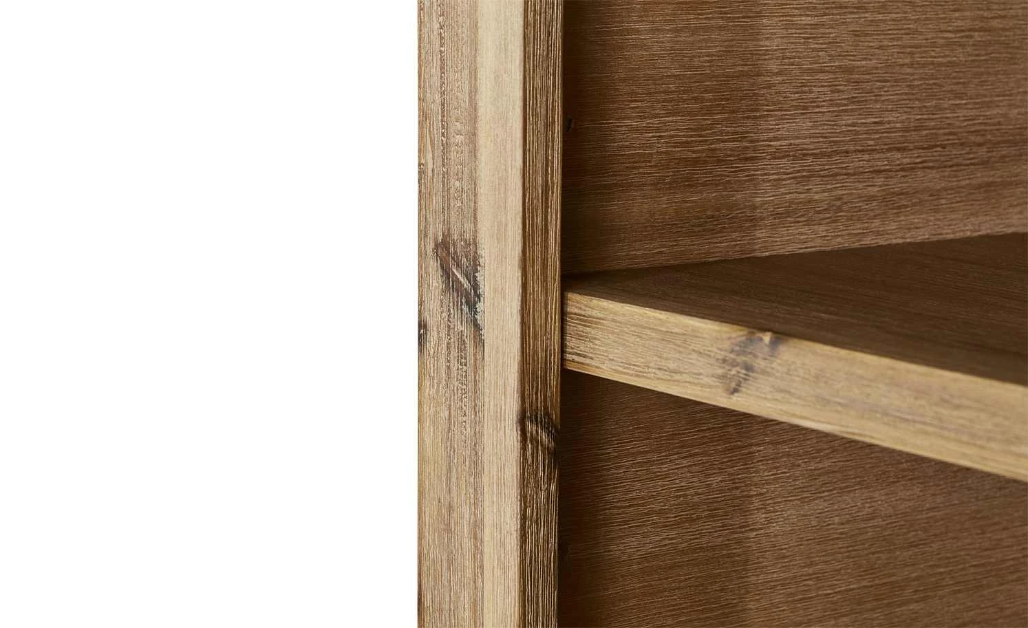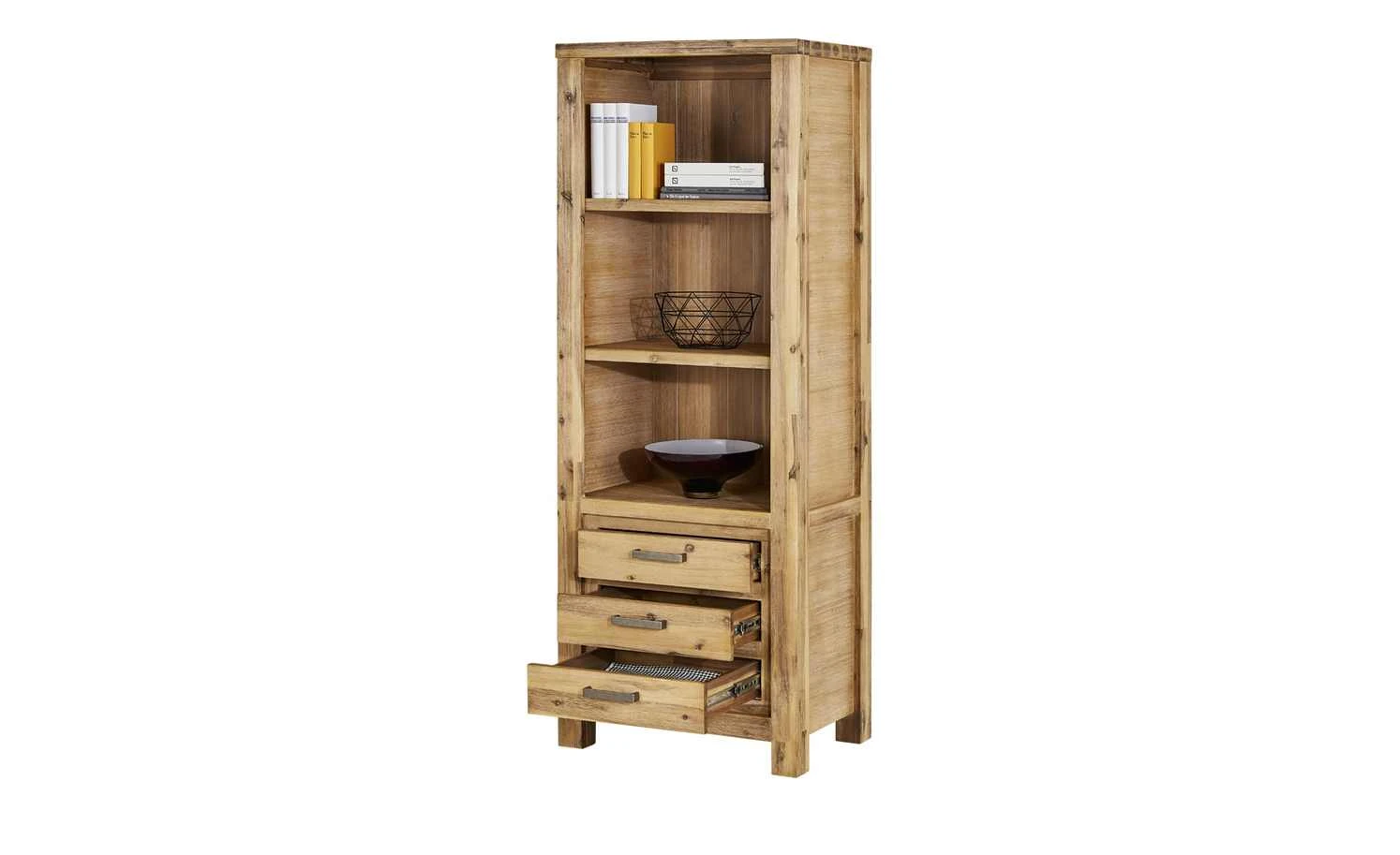 Das Regal Borneo ist aus edlem Akazienholz gefertigt. Der Rahmen und die Front bestehen aus massiver Akazie. Der Korpus ist mit dem hochwertigen Holz furniert. Die Oberfläche ist sandfarbig gebeizt und lackiert. Borneo verfügt über drei große offene Regalfächer. Sie eignen sich für Bücher oder Deko. Zusätzlich stehen Ihnen drei geräumige Schubladen zur Verfügung. Die drei Bügelgriffe sind aus stabilem Metall. Ich angesagter Used-Look harmoniert mit der rustikalen Akazie.