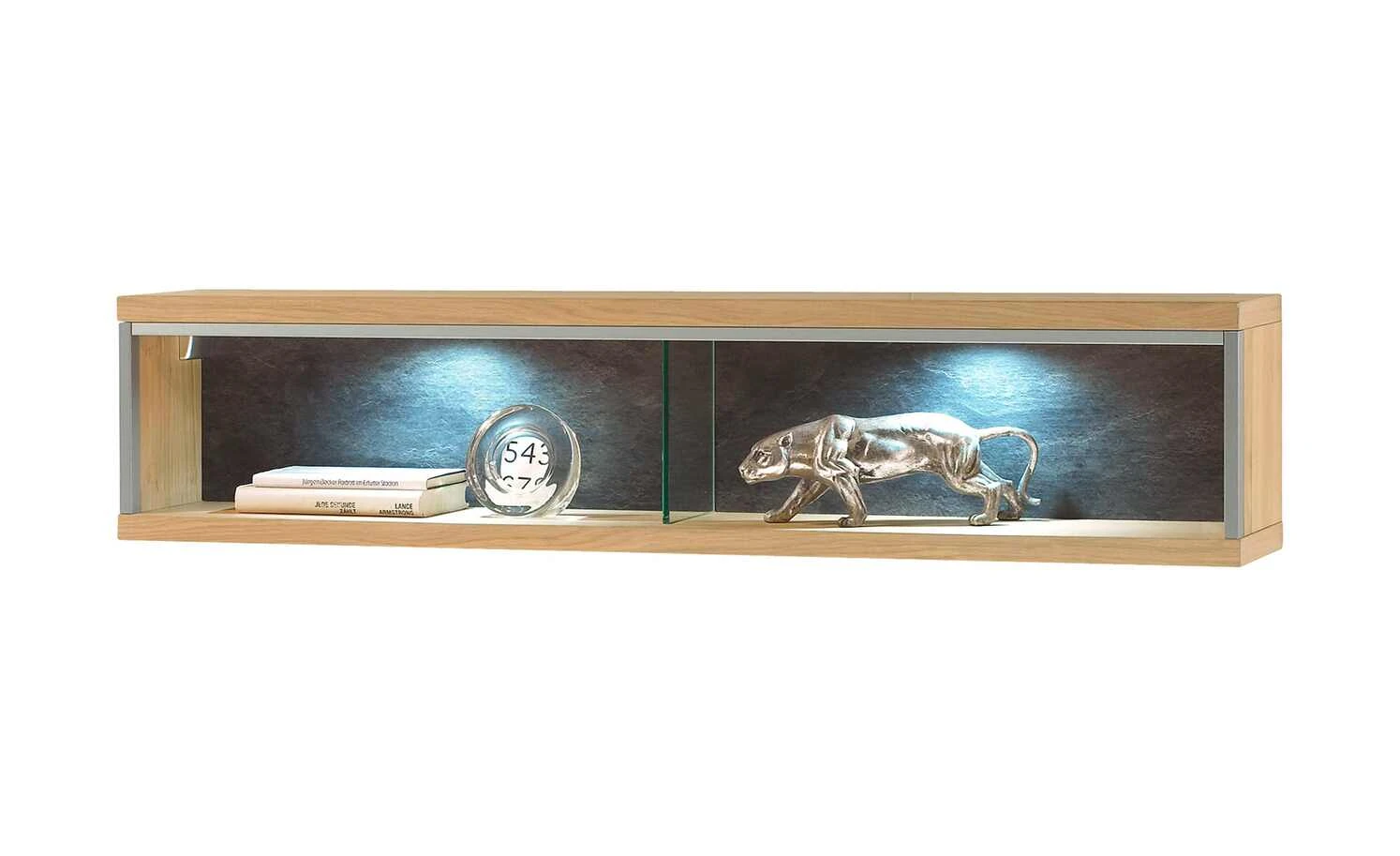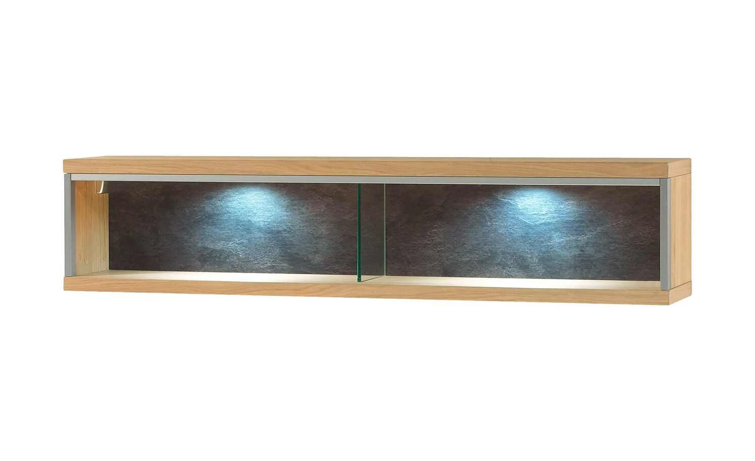 - Mehr zum Material: Absetzung Metall in Edelstahloptik, Innen Eiche Bianco (Nachbildung), Sichtbare Rückwand: Schiefer (Nachbildung)