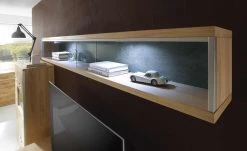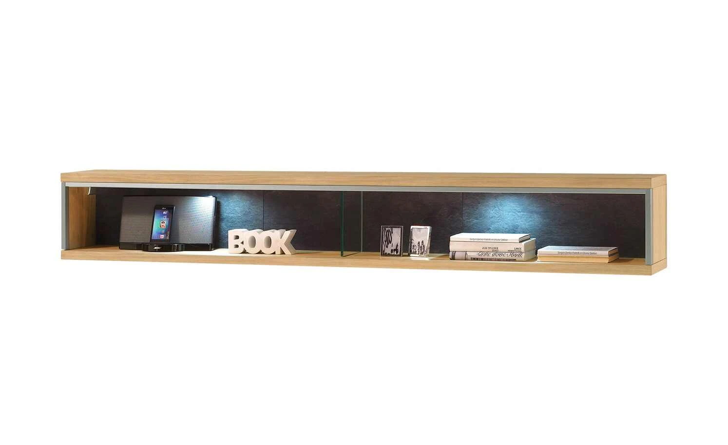 Im Wandregal Felino finden Bücher und auch Dekorationen ihren Platz. Vor der Rückwand in Schieferoptik (Nachbildung) kommen diese besonders gut zur Geltung. Die beiden geräumigen Regalfächer werden durch eine Trennwand aus Glas voneinander getrennt. Felino ist furniert, wobei edle Eiche Bianco verwendet wurde. Die Maserung und Holzstruktur ist gut zu erkennen und setzt sich charmant vom Schieferton ab. Zusätzliche Akzente werden durch die Absetzungen im Edelstahllook gesetzt.